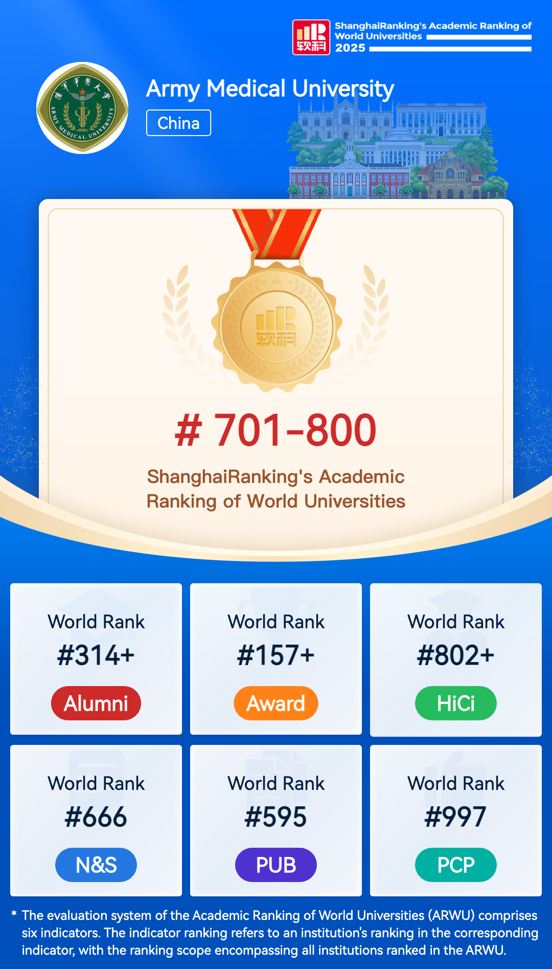 The Academic Ranking of World Universities (ARWU) is recognized as the precursor of global university rankings and the most trustworthy one. ARWU presents the world's top 1000 research universities annually based on transparent methodology and objective third-party data.
