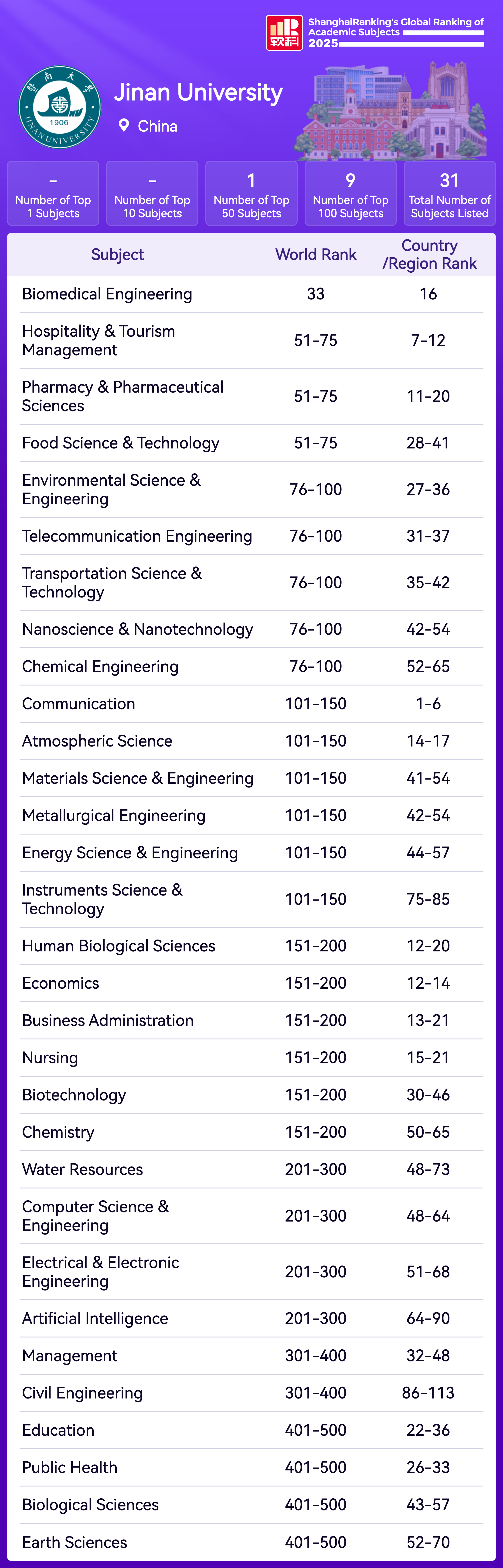 There are many special features that Jinan University can be proud of : one of the oldest universities in China and one of the “211” key national universities in China the 1st university in China that recruits foreign students the 1st university in China that enrolls students at both spring and autumn semesters the 1st university that pioneered the implementation of credit system in China the university with the largest number of overseas students the only university that finds her alumni in both Chinese and foreign state-level leaders in China...... The University has 25 colleges, comprising 55 departments and offering 86 undergraduate major fields. There are 15 post-doctorial research stations, 170 research institutes and 84 labs in Jinan University. The university has 4 national key disciplines, 14 Guangdong Province Level-I key disciplines, and 20 Guangdong Province Level-II key disciplines. The university also has a key research base of national humanity & social sciences, a teaching & research base for Chinese language & literature of the Education Ministry, a base for national university cultural quality education, a base of national base for teaching Chinese as a foreign language, an educational base for overseas Chinese education of the Overseas Chinese Affairs Office of the State Council and a key research base of humanity & social science of Guangdong Province. Still, the university has 1 national engineering center, 12 ministerial centers (engineering centers of the Ministry of Education) and provincial centers, and 13 key ministerial and provincial key laboratories. The four campuses of Jinan University locate in three cities, Guangzhou, Shenzhen and Zhuhai. And a new campus is being built in Guangzhou. The four campuses cover a total area of 1,695,200m². The total floor area of the buildings of the four campus cover is 1,076,700 m², and that of student dormitories is 259,000 m². The University has 16 affiliated hospitals with altogether 11,426 sick beds. The staff of the 16 hospitals totals 14,187. JinanUniversity has been active at academic exchanges, and has established academic cooperation or academic exchange liaison with more than 180 universities and research institutes in Asia,America, Europe, and Oceania.