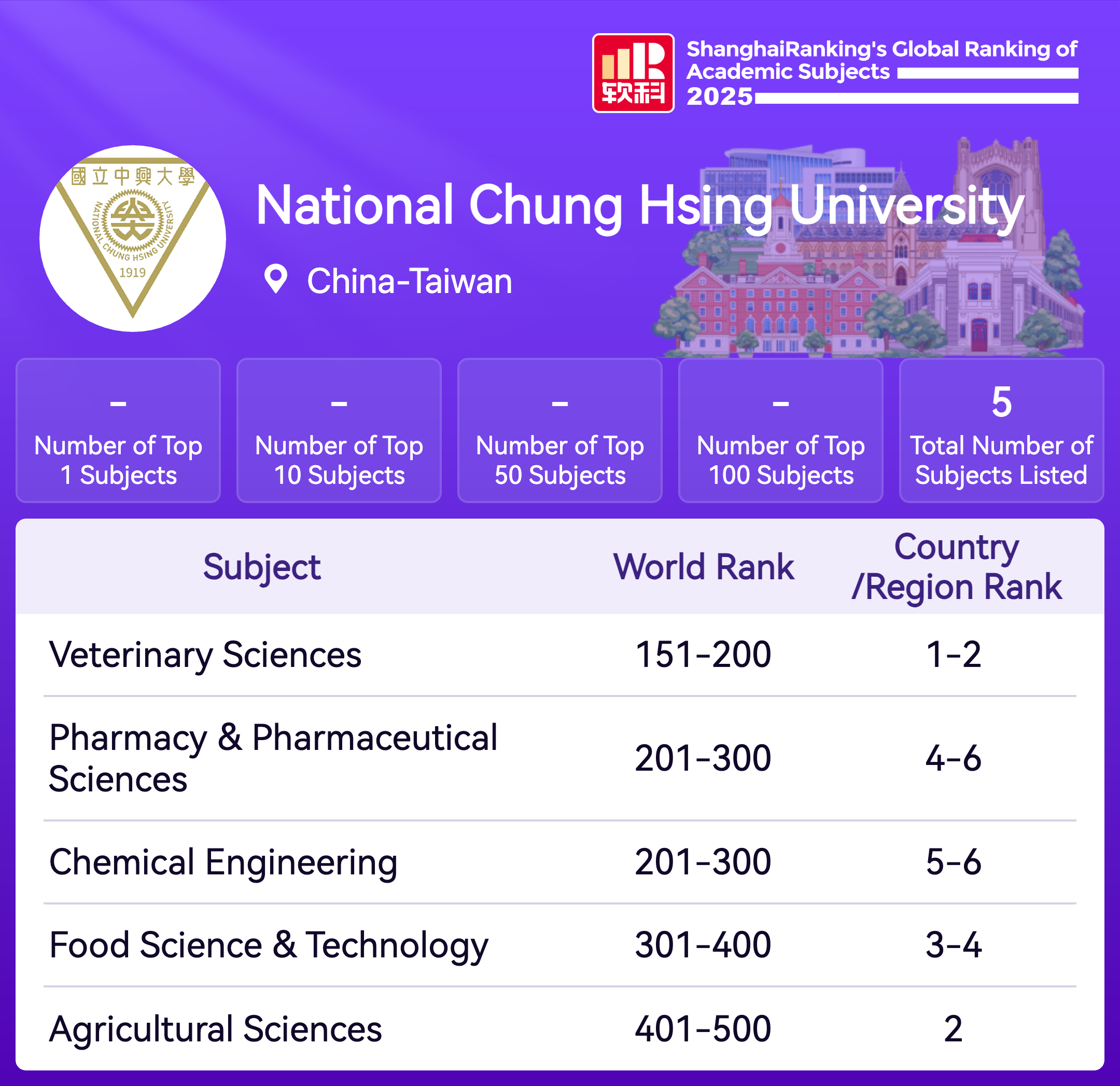 National Chung Hsing University (NCHU) traces its origins back to the establishment of the Advanced Academy of Agronomy and Forestry in 1919, making it one of Taiwan's oldest and the third-largest research-oriented comprehensive national university in the country. NCHU comprises 11 colleges, the International College of Innovation and Industry Liaison, and 57 research centers. The university owns four experimental forest stations, two agricultural experiment stations, and one livestock experiment station, encompassing a total land area of over 8,000 hectares. The university has about 870 full-time faculty and about 16,064 students, with graduate students constituting approximately 43% of the total student population. NCHU strategically utilizes its top-tier research centers as a foundation to integrate teaching and research resources from both within and outside the campus. The university supports interdisciplinary talent development, promotes international academic exchanges, enhances its global reputation, fosters academic-corporate collaborations, and partners with top international universities to establish cross-border research teams, forging substantive cooperative relationships that drive comprehensive institutional advancement.