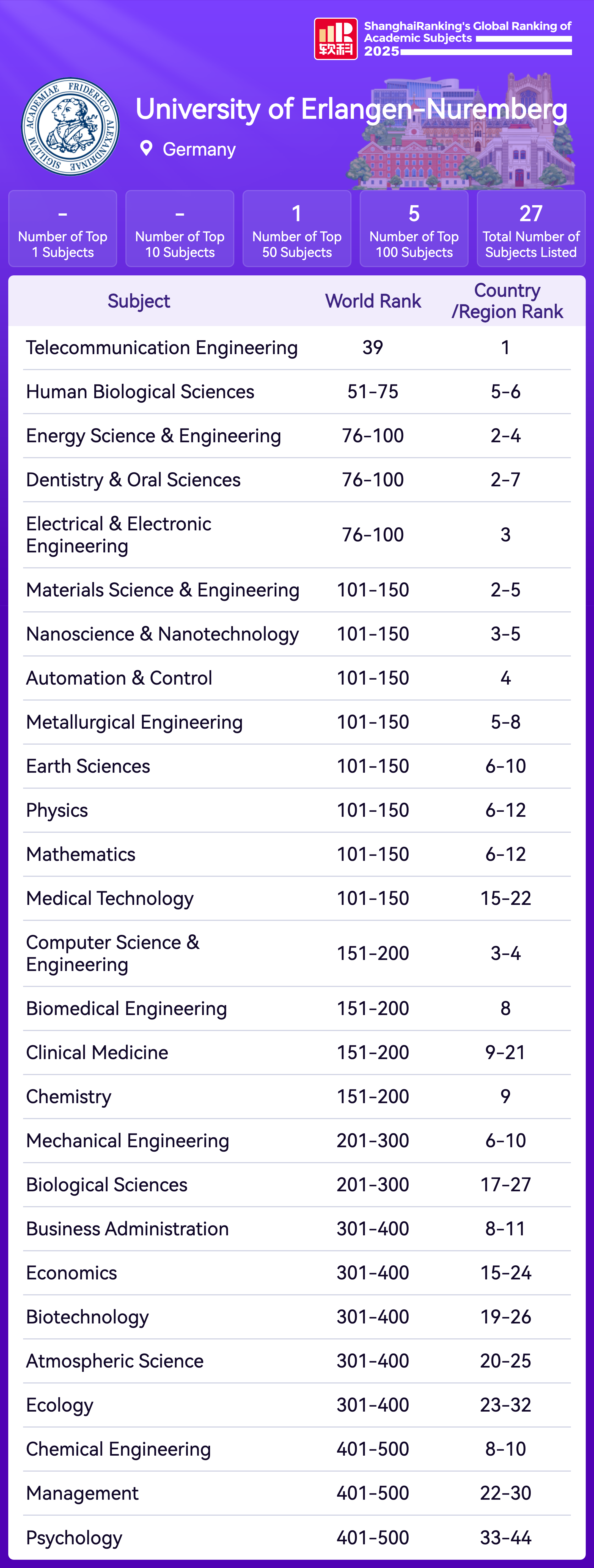 Founded in 1743, the Friedrich-Alexander-Universität Erlangen-Nürnberg (FAU) is today one of the largest research universities in Germany with around 40,000 students who work closely with an internationally recognized faculty and research staff. The university offers classes and research possibilities in a wide range of subjects organized in five faculties: i) Humanities and Theology, ii) Business, Economics, and Law, iii) Medicine, iv) Sciences, and v) Engineering. At the Master’s level in particular, many subjects are taught entirely in English. The cutting-edge research that takes place at the FAU has helped place it among the top ten universities in the latest ranking conducted by the German Research Foundation (DFG). Furthermore, according to their international bibliometric ranking systems, the Leiden (CWTS) and the Higher Education Evaluation and Accreditation Council of Taiwan (HEEACT) have ranked the FAU 6th and 8th among German universities, respectively. The FAU is a leading research institution in a number of interdisciplinary projects that bring together researchers from various faculties. Internationally recognized projects include work in: i) new materials and processes, ii) optics and optical technologies, iii) molecular life sciences and medicine, iv) health technology, v) electronics, information and communication, vi) energy, environment and climate, vii) language – culture – region, and viii) cohesion – transformation – innovation in law and economics. In recognition of its outstanding achievements, the FAU receives special federal funding for the following high profile research initiatives: the Cluster of Excellence ‘Engineering of Advanced Materials’, the Erlangen Graduate School in Advanced Optical Technologies, the ‘Medical Valley’ Leading Edge Cluster in Health Technology and the International Consortium for Research in the Humanities ‘Fate, Freedom and Prognostication’. The FAU offers globally competitive research conditions for graduate students, doctoral candidates and young researchers. It provides a state-of-the-art scientific infrastructure as well as intensive research mentoring and support. FAU students receive world-class training in an inspiring environment with access to exciting international exchanges and career prospects. The global vision of the university is exemplified by the recently established FAU Busan Campus in South Korea. The FAU also benefits from collaborations with other excellent research institutions in Erlangen and Nürnberg including the Max Planck Institute for the Science of Light, the Fraunhofer Institute for Integrated Circuits and the Fraunhofer Institute for Integrated Systems and Device Technology. The FAU drives the development of innovative technologies across the entire ‘European Metropolitan Region of Nürnberg’, a highly productive and economically thriving area in Germany, with 3.5 million inhabitants generating more than 4% of the GDP. The city of Erlangen has the highest number of patents relative to inhabitants according to the Eurostat statistics of the European Union. One prominent example is the development of the MP3 standard. The region is proud of its superb education system and offers excellent prospects for future employment and academic research.