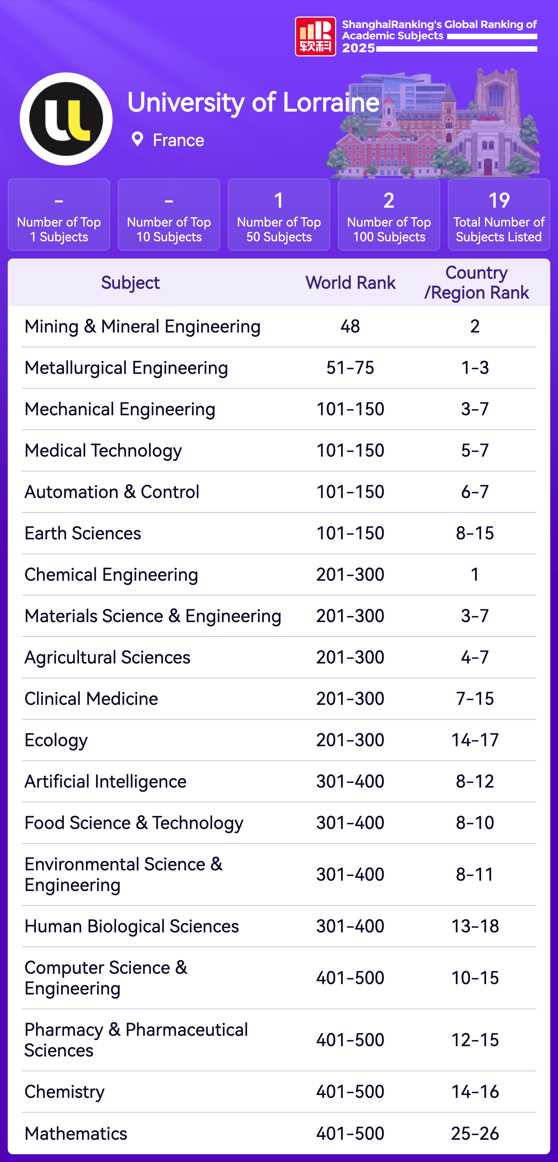 Université de Lorraine (UL) is a public institution created after the merge of four universities of the Lorraine region in north-eastern France. Though the University was founded in Lorraine in 1572, the fusion that took place in 2012 created a hub of scientific advancement, economical growth and knowledge transfer. 60,000 students, 6,900 staff members, 43 teaching departments and 60 research centers make the UL one of the largest universities in the country. Campuses are situated throughout the region, each with their own focus. UL offers curricula in all fields of knowledge. A specific focus is given to cross-talk between fields and competences, in order to help students develop individualized career paths. The Lorraine region has been shaped since the 19th century by the mining and metallurgical industries, which fostered the development of education and research in engineering and technology. During the 20th century, this concept of engineering took on a broader meaning of global engineering, i.e. the ability to design, develop, validate and implement innovative solutions to global challenges, by relying on disciplinary excellence to address the basic scientific questions, and illuminating the connections between scientific domains and current economic and social challenges. UL thus positions itself as a multidisciplinary, technological and entrepreneurial university, able to develop comprehensive answers to the economic and societal challenges of the 21st century. Another specificity is the multilingual aspect of many curriculums, due to sharing borders with Belgium, Luxembourg and Germany. The UL has strong ties with universities from those countries and students and faculty members alike can take advantage of numerous exchange programs. UL also develops a network of privileged, strategic partnerships with a selected number of universities throughout the world.