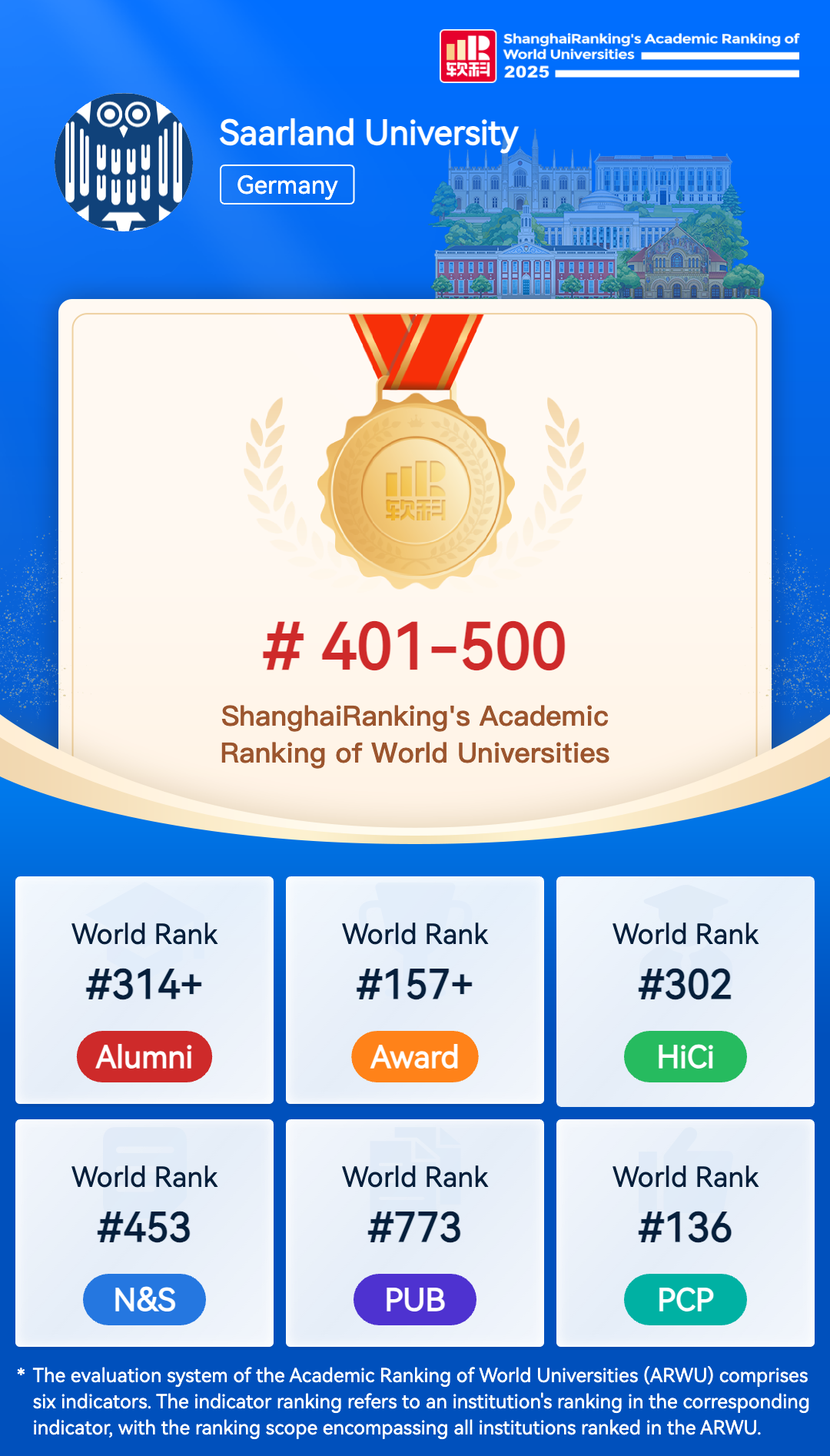The Academic Ranking of World Universities (ARWU) is recognized as the precursor of global university rankings and the most trustworthy one. ARWU presents the world's top 1000 research universities annually based on transparent methodology and objective third-party data.
