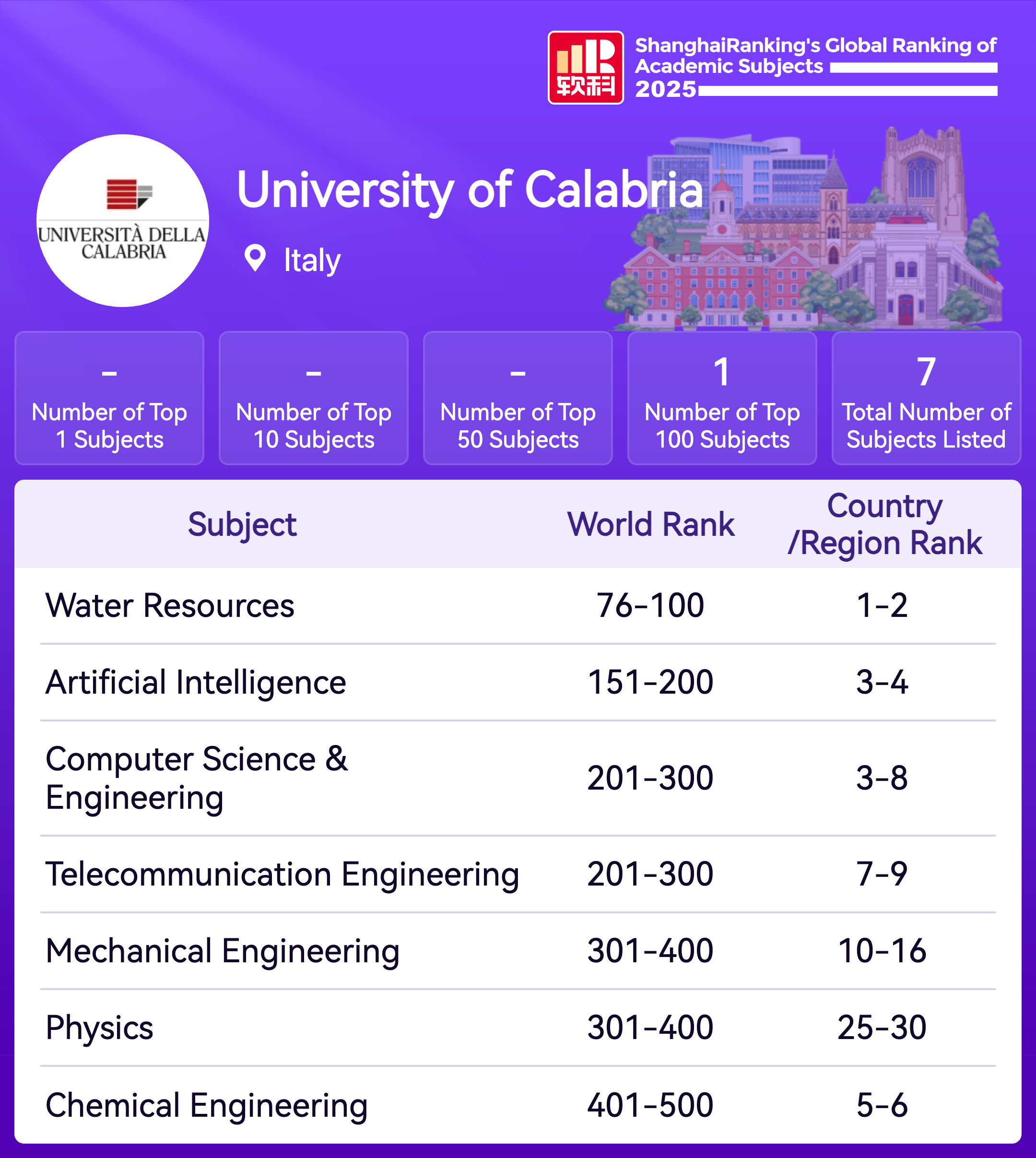 The University was created in 1972, as the first University in Calabria (UNICAL). It offers 31 Bachelor's and 49 Master's degrees in Engineering, Political and Social Sciences, Pharmacy and Nutrition, Economics, Statistics, Finance, Law and Business Administration, Humanities, Education, and Sciences (Chemistry, Biology, Physics, Geology, Natural Sciences, Mathematics and Computer Science). Moreover, UNICAL offers about 10 PhD programmes. The number of students is about 25,000. The language of teaching is Italian, but support in English (exams, final dissertations, tutoring, presentations during classes...) is offered to international students. Furthermore, the University of Calabria offers 4 Master’s Degree programmes entirely in English: Computer Science, Finance and Insurance,Computer Engineering for the Internet of Things and Nutritional Sciences and 2 Master’s Degree programmes partially in English: Modern Philology (Italian Studies curriculum) and Management Engineering. It is located in a residential Campus that can accommodate over 2,500 students. International students are welcome in the framework of different programmes, such as UnicalAdmission, Erasmus +, extra-EU exchange programmes etc. and within a scheme of grants including board and lodging provided by the Calabria Region. Currently, 800 international students, coming from 80 different countries, are enrolled at UNICAL. In the Italian ranking system of CENSIS, UNICAL holds the 4th position in the group of "big" Universities, i.e. those with 20-40,000 students. UNICAL currently ranks 601-800 in the general THE World Rankings 2020 and has been included in the QS Rankings for the first time, where it stands out in the Citations indicator (406th). In theTHE University Impact Rankings 2020, it stands out for its sustainability policies, ranking 101st in the category "Sustainable Cities and Communities"