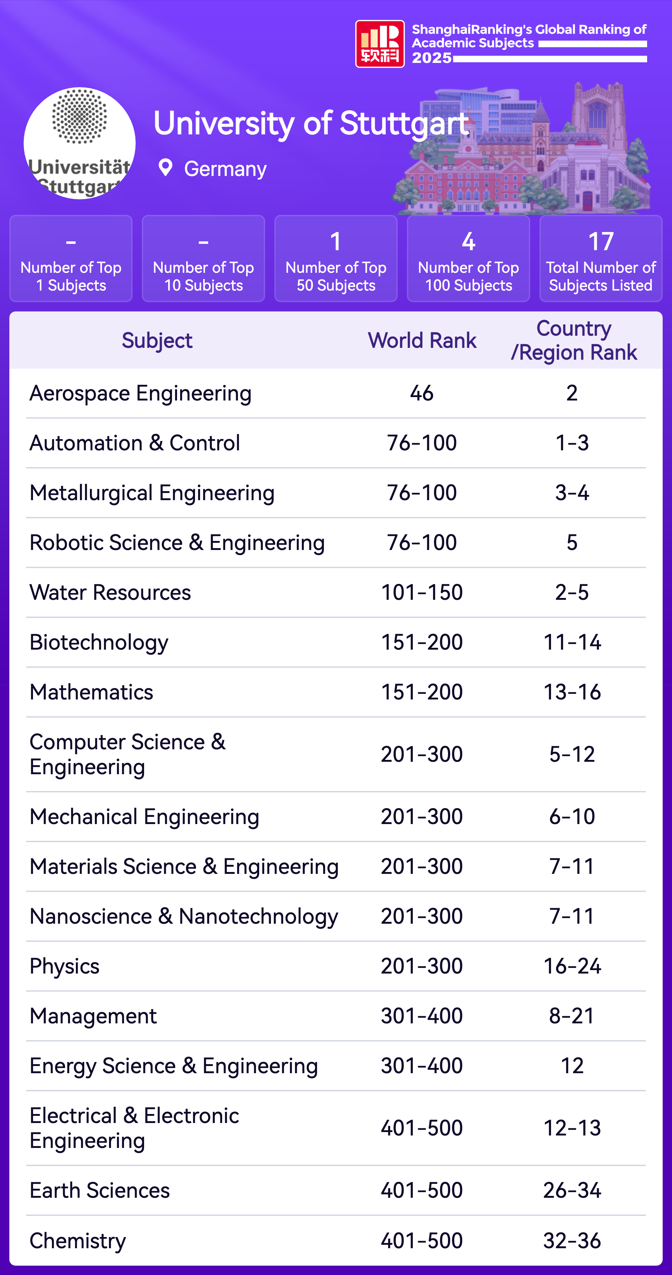 The University of Stuttgart is situated in one of Europe's most dynamic economic regions with a worldwide reputation for excellence in the fields of mobile and information technology, production, process engineering as well as in life sciences. Founded in 1829, the former College of Technology has now grown into a research-intensive university which has its focus on Engineering and Natural Sciences, with a unique profile that concentrates on closely networking these disciplines with the Humanities and Social Sciences. The university offers its students more than 100 Bachelor and Master study programs. Among them are ten internationally oriented MSc courses taught in English and two German-French MA courses. Furthermore, there are courses held in cooperation with renowned universities abroad as well as online study programs for people in full-time employment. 4,800 employees work in over 150 institutes, 10 faculties and in central institutions at the University of Stuttgart. At the moment, around 25,000 students are registered (two thirds among them in engineering sciences). The share of international students (20%) is far above average. With its focus on Engineering and the Natural Sciences and their embedment in society and the economy, the University of Stuttgart is one of Germany's most successful research universities and is a member of TU 9, a group of the leading technical universities in Germany. The university ranks fourth in Germany with regard to third-party funding per professor (Federal Statistical Office 2008) and is among the top ten for German recruiters from every industry sector (Wirtschaftswoche 2010). Research projects at the University of Stuttgart include the Cluster of Excellence “Simulation Technology” and the Graduate School “Advanced Manufacturing Engineering”, both of which were successful in the recent “Excellence Initiative” by the Federal and the State governments, as well as numerous collaborative research centres, research units, and EU projects. The university hosts one of the three federal High-Performance Computing Centres and is a Cooperative Research Campus for ARENA2036 (Active Research Environment for the Next Generation of Automobiles). The main fields of research can be specified as follows: "Complex systems and communication", "Modelling and simulation technology", "New materials", "Design and technology of sustainable living spaces", "Integrated product and production design", "Mobility", "Sustainable energy supply and the environment", and "Technology concepts, technology contexts and technology assessment". As campus university with two well connected locations, close to attractive recreation possibilities in the environment and closely integrated into the cultural live of the city, the university provides the best conditions for studying and working as well as a diversity of job chances for graduates in one of Europe's strongest economic regions home to companies such as Daimler, Bosch, or Porsche. Together with modern information technologies, comfortable hostels and housing for guest lecturers, the neighbouring institutions of the Max Planck-, the Fraunhofer Institute and the German Aerospace Center constitute a fertile ground for innovations and scientific communication.