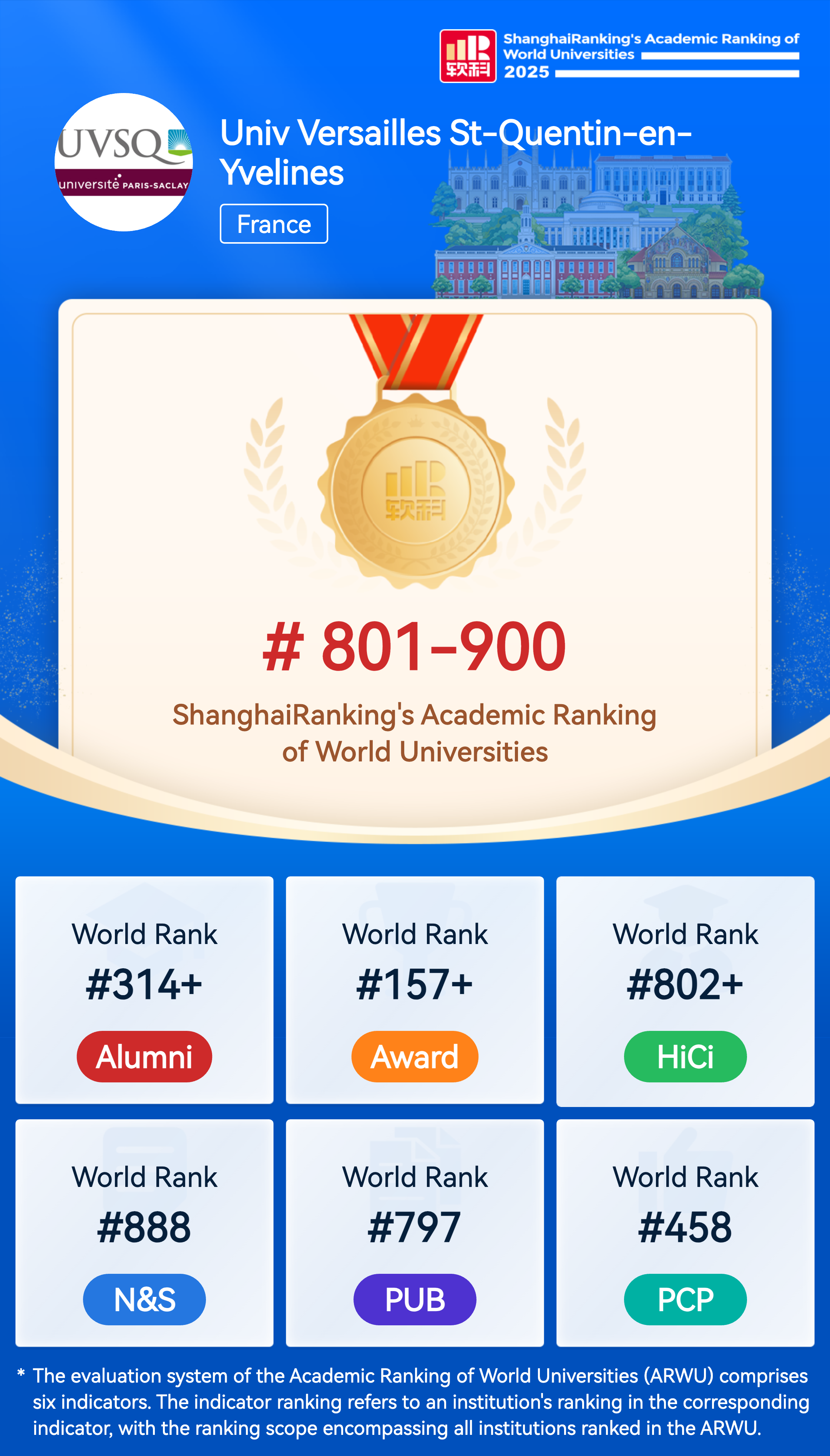 Founded in 1991, University of Versailles Saint-Quentin-en-Yvelines (UVSQ) is a multidisciplinary institution located 15 kilometers west of Paris, in the district of Yvelines, with sites in seven towns: Versailles, Saint-Quentin-en-Yvelines, Mantes, Rambouillet, Vélizy Villacoublay, Saint-Germain-en-Laye and Saclay. UVSQ plays an important role in the economic, social and cultural development of the area which is known for its unique natural and historical heritage as well as its highly dynamic economic activity. Home to over 17000 students, UVSQ offers a large range of courses at bachelor, master and doctorate level, in different academic fields such as environmental studies, science and technology, engineering, medicine, law, political science, human and social sciences, economics and management. UVSQ also covers various types of needs: apprenticeships, distance learning and education for employees or job seekers. Being a proximity university actively involved in public-private partnerships, UVSQ has strong links with the socioeconomic environment and provides students with support to professional orientation. Since its creation, UVSQ has been strongly committed to developing an excellence research strategy. Most of its 32 laboratories and research units are associated with major French research organisations such as CNRS, CEA, INSERM, Pasteur Institute and INRIA, and are locally and internationally recognized as a source of expertise and resources. UVSQ has become a major player in fields such as atomic energy, space science, climate, environment, medicine, epidemiology, technology and complex systems, but also in humanities, social sciences, law and political science. Engaged in many national and European research projects, UVSQ’s laboratories proved their ability to establish pathways between different research domains. They developed cutting-edge competences in fundamental research as well as in new sectors, driven by societal challenges (sustainable development, global warming, public health, handicap, cultural heritage) and innovation (nanosatellite technology, materials, high performance computer, cryptography, data security and management). As part of its international strategy, UVSQ strongly supports the globalization of its education and research. It is an active member of the regional and European research as well as higher education networks and communities, with multiple effective partnerships worldwide, for students and staff exchanges, international education programs, double diploma, research collaborations, joint projects and PhD students in joint supervision. In addition, UVSQ is a founding member of the newly created Paris-Saclay University, founded as part of an expending research-intensive and business cluster in the southwest of Paris, in a region which shows high continuous economic growth. This world-class excellence university brings together 65.000 students, 9000 researchers, 7 research organisations, 3 universities and 9 engineering and business schools.