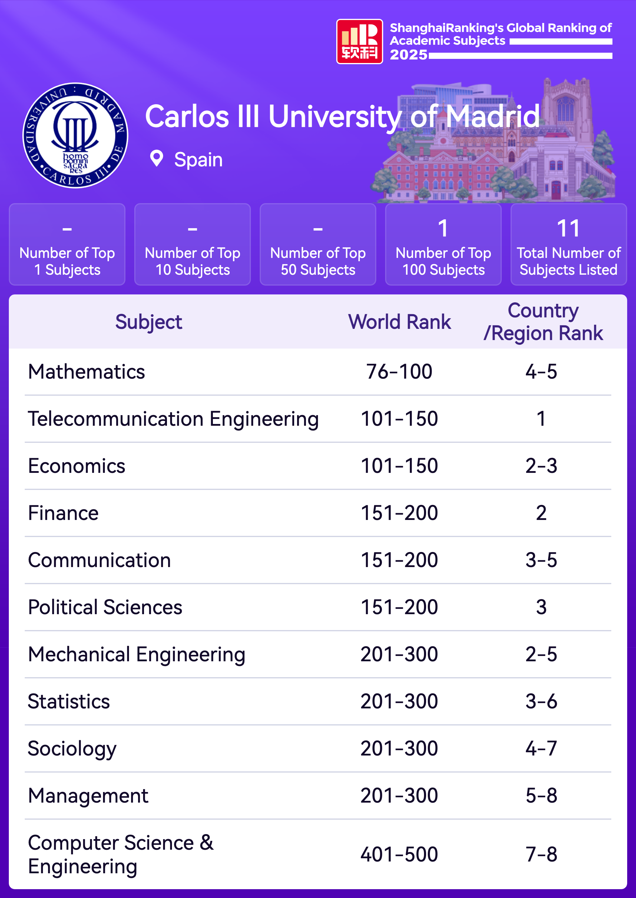 Universidad Carlos III de Madrid is an innovative research university with a distinctly international profile. It offers a broad range of master’s and bachelor’s degree programs in English and nearly 20% of the student body is made up of international students. It is the first university in Spain and the third in Europe in the number of its students participating in the Erasmus student exchange programs. Thanks to "Carlos III International School" the university boost international non-European exchange programs with the USA and Asia, among others. Furthermore, it is firmly committed to digital learning, forming part of the prestigious educational platforms edX, Miridiada X and Opencourseware. NEW for academic year 2020/2021: hybrid teaching and learning model: Face-to-face classes will be combined with synchronous and interactive online classes, ensuring quality teaching and complying with health and safety measures. The University offers programs in Economics and Business, Engineering, Law, Communication, Social Sciences and Humanities. Has several Quality Distinctions and Accreditations: EUR-ACE quality certificate (bachelor degrees in Engineering), AACSB accreditation (business administration degree programs), CAIA Association (Master’s in Finance program), accredited by the Association of MBAs (AMBA) (MBA- Máster Universitario en Administración de Empresas) and Association of Chartered Certified Accountants (ACCA) (bachelor’s degree in Finance and Accounting). UC3M students are able to carry out internships through collaborative agreements the University has signed with different companies and organizations. Furthermore, this institution has distinguished itself through the high job placement rate of its graduates, which, according to the latest study on career placement, is nearly 90%. Students have access to a wide array of cultural and sport activities, as well as several sports centers. The University also provides first-rate student housing.