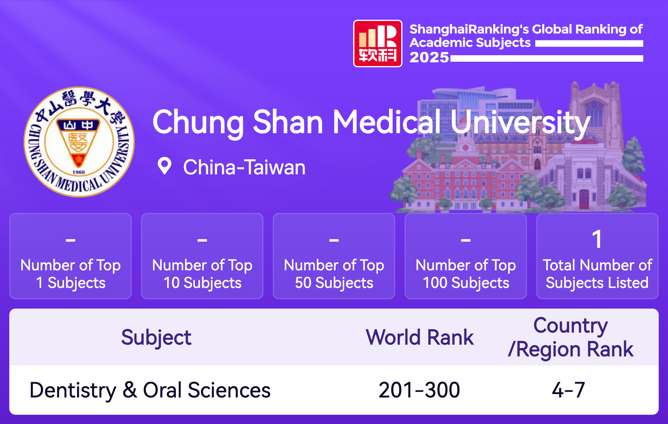 Overview Established in 1960. Upgraded in 1977. Renamed in 2001 Brief History of Chung Shan Medical University Due to the shortage of dentists in the post war era during the 59's in Taiwan, Dr. Ju-Chuan Chou founded Chung Shan Dental Junior College (the antecedent of Chung Shan Medical University) in 1960 with the purpose of training dentists. The school was named after Dr. Sun Yat-Sen, alias Chung-Shan, in recognition of his patriotism. The demand for the institute to be elevated to the college level was growing with the time. After much effort and program enforcement, in 1977, our school was granted by the Ministry of Education to advance to Chung Shan Medical and Dental College. Yet, we kept progressing and expanding. In 2001, the institute was reorganized as Chung Shan Medical University (CSMU). Organization Currently, the CSMU consists of five colleges, which are College of Medicine, College of Oral Medicine, College of Medical Sciences and Technology, College of Health Care and Management, College of Medical Humanities and Social Sciences, and College of Nursing. There are 21 academic departments and 22 graduate institutes. We have about 412 full-time faculty, 259 part-time faculty, and 273 staffs working on campus. And about 7,096 undergraduate and graduate students are enrolled. In addition, as a medical university, we have five affiliated hospital districts --- Da-Ching District, Chung-Kang District, Wen-Hsin Distric and Chung-Shing District. Each district has its own specialties and the state-of-the-art clinical facilities, e.g. the first PET scanning machine in Taiwan. Contribution to the Society and Eminent Alumni For the past 59 years, Chung Shan has educated numerous outstanding graduates. They devoted mostly to the medical care for societies all over the world. Many of our alumni also played a vital role in various leadership, like the Director of Department of Health in Executive Yuan, the Mayor of Kaohsiung City, key cabinet members, Members of Parliament, and chairs in the related fields of medicine and dentistry.