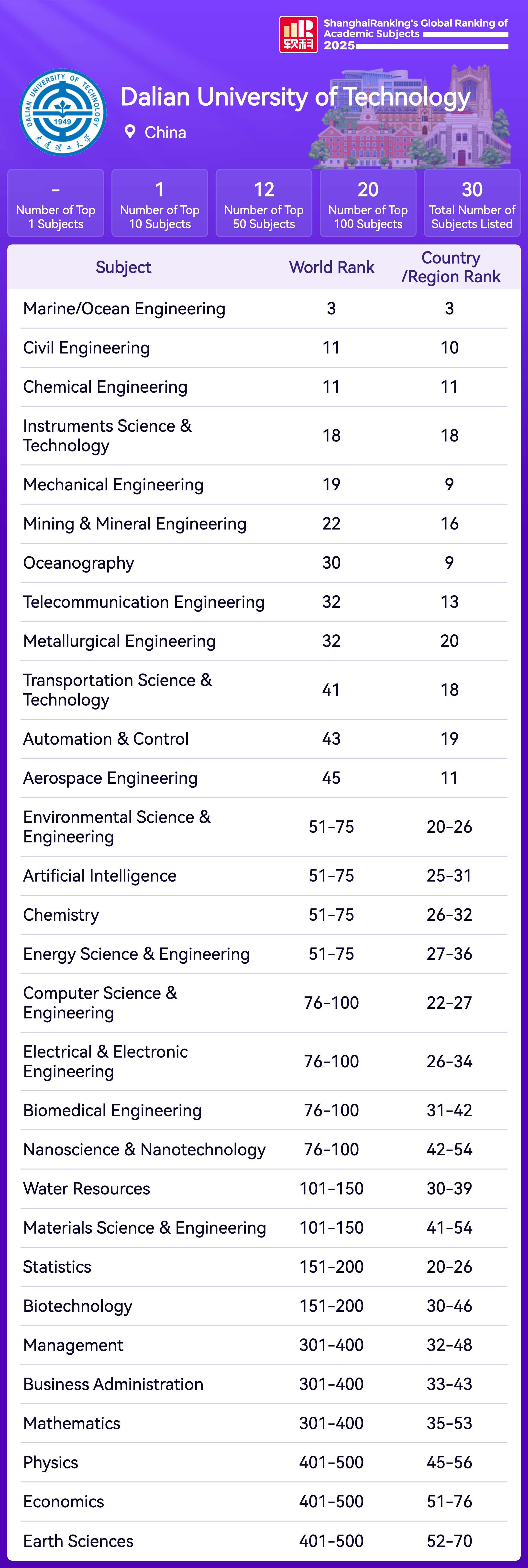 Dalian University of Technology(DUT) is located in the beautiful coastal city of Dalian, in northeastern China's Liaoning Province. It is one of the key universities under the direct leadership of the State Minstry of Education. The campus is green,shady and peaceful. Many state leaders have visited the university and enjoyed its beauty. Having experienced the severe trials of sixty years, and having gone through the persistent efforts of several generations, DUT has developed into a comprehensive university of science and technology. Engineering is DUT's main concentration,with other departments including applied sciences and economic management sciences,as well as humanities disciplinces,which include the social sciences and law. DUT enjoys a good reputation for its rigid management and its good environment for study. The University is known for its motto:" Unity,Enterprise, Realism and Originality". DUT has forstered and trained more than 100,000 men and women of various professions,who are widely welcomed throughout the society. With the support of "the 985 Project" and "the 211 project", bringing forth the spirit of innovation, DUT is engaged in grasping the historic opportunity of rejuvenating the old northeastern industrial base, and carrying out a talent-training strategy in the hope of building DUT into a world-famous research university.