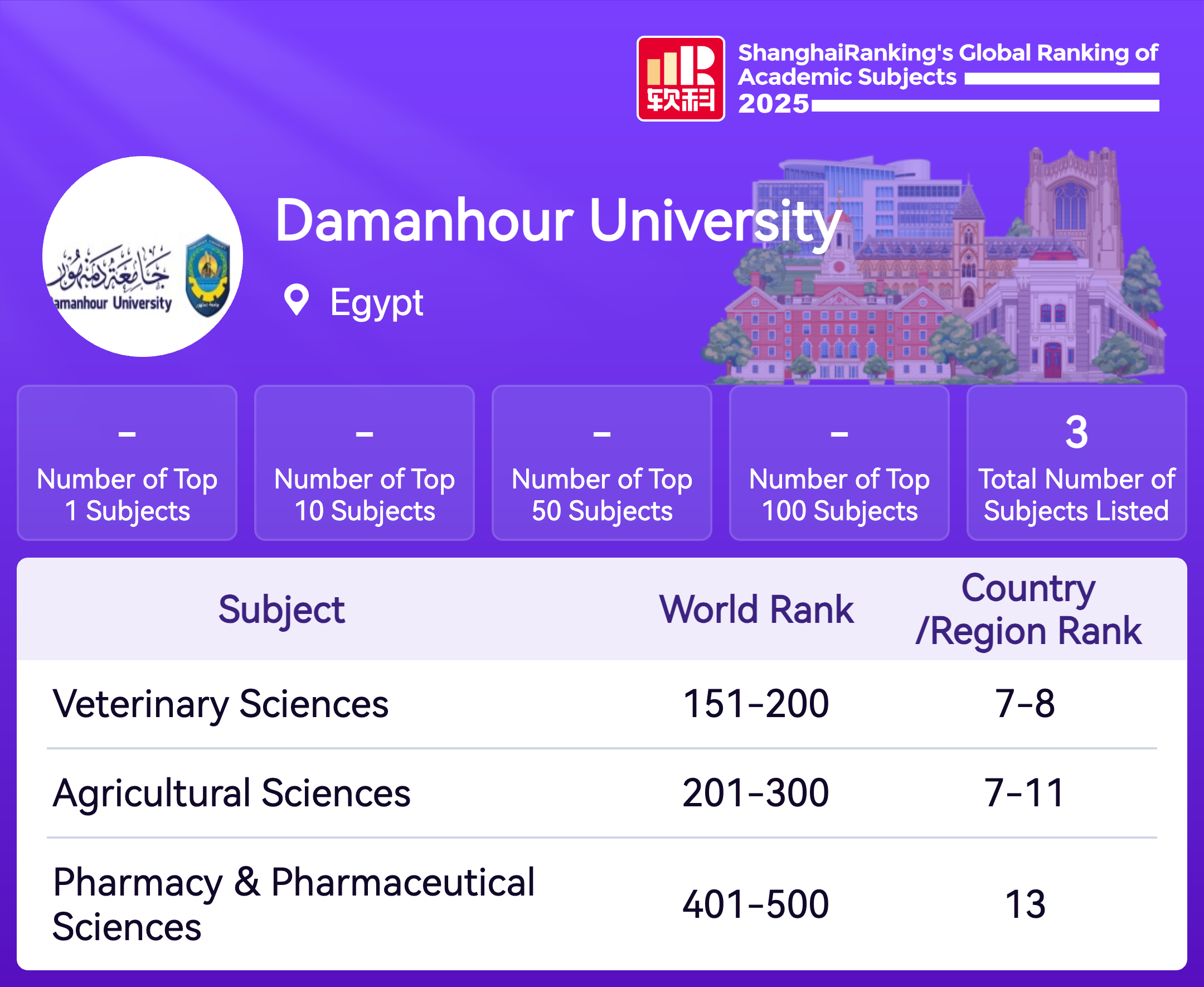 Damanhour University is a public university that was established after its separation from Alexandria University by Presidential Decree No. (303) dated October 26, 2010. It is subject to the Egyptian Universities Law No. 49 of 1972. Therefore, it is newly established but has a long history of foundation. Damanhour University has a membership in the following Arab and international federations: Association of Arab Universities. Mediterranean Universities Union. Francophone Universities Union. Network for Quality and Performance Measurement of Universities at the Islamic Authority for Quality Assurance and Accreditation. Damanhour University got the (ISO 9001/2008) certificate in 2014.