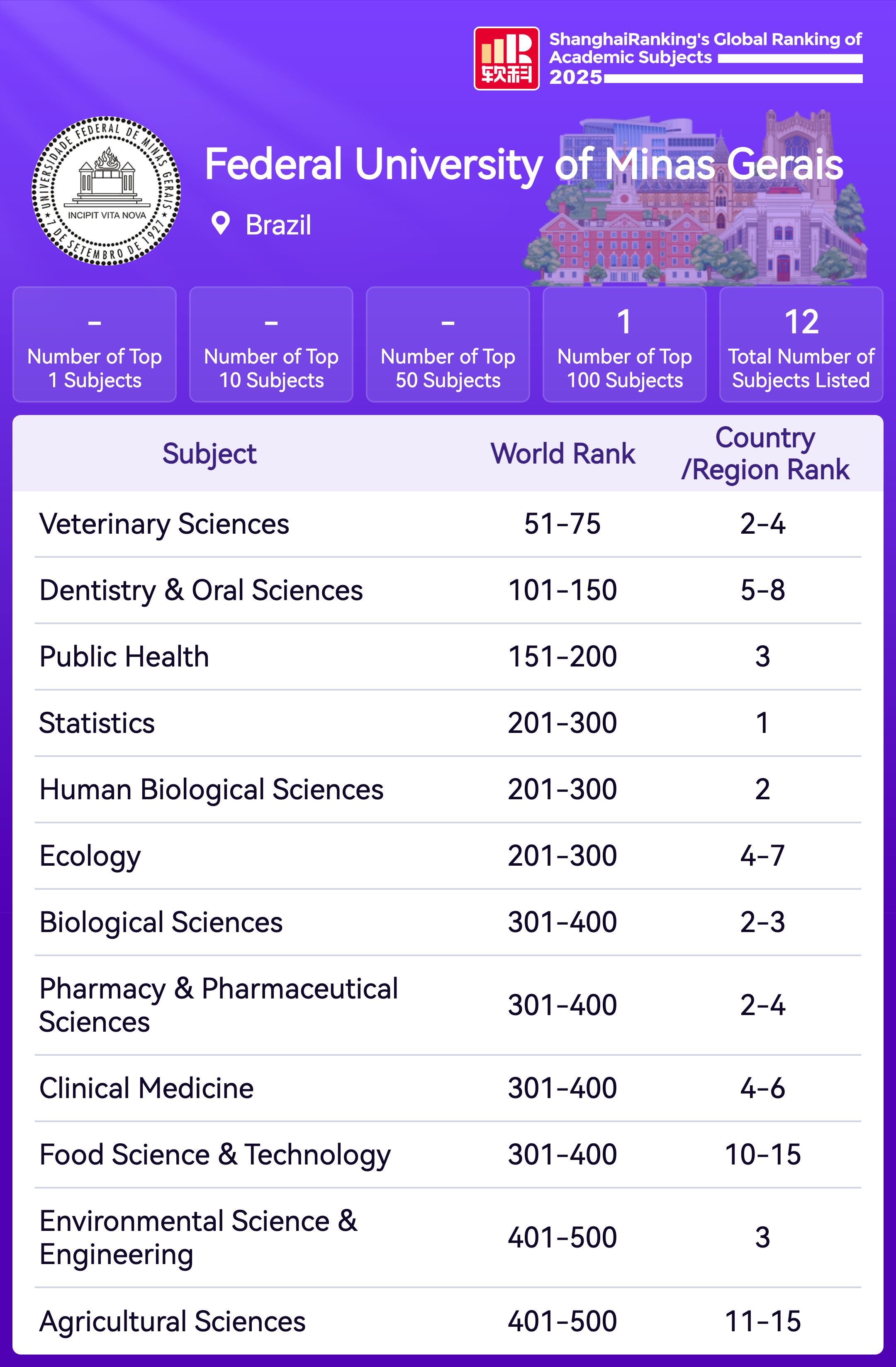 Universidade Federal de Minas Gerais (Federal University of Minas Gerais – UFMG) is a public institution, recognised as an outstanding centre of excellence in Brazil, both in terms of academic-scientific production and professional training in the context of the Brazilian higher education system. UFMG has four campuses occupying a total area of 8,76 million square meters and a built-in area encompassing 639 thousand square meters. Altogether UFMG has 20 academic units, 03 special units, 03 administrative units, 02 hospitals and 25 libraries. The University offers 75 undergraduate courses, 78 graduate programs and 68 continuing education ones, in all fields of knowledge, with more than 50,000 students enrolled. 95% of UFMG's undergraduate courses have maximum score on the IGC indicator (General Undergraduate Course Index Brazilian Ministry of Education), and 68% of UFMG graduate programmes at PhD level are classified as centres of excellence according to assessments made by the Brazilian Ministry of Education. Abroad, UFMG is one of the Brazilian universities that stands out in the main universities rankings. As one of Brazil's largest research universities, UFMG is committed to strike a balance between the high quality of its courses in both undergraduate and graduate levels, the expanding impact of its research, and the growing social relevance of its academic activities.