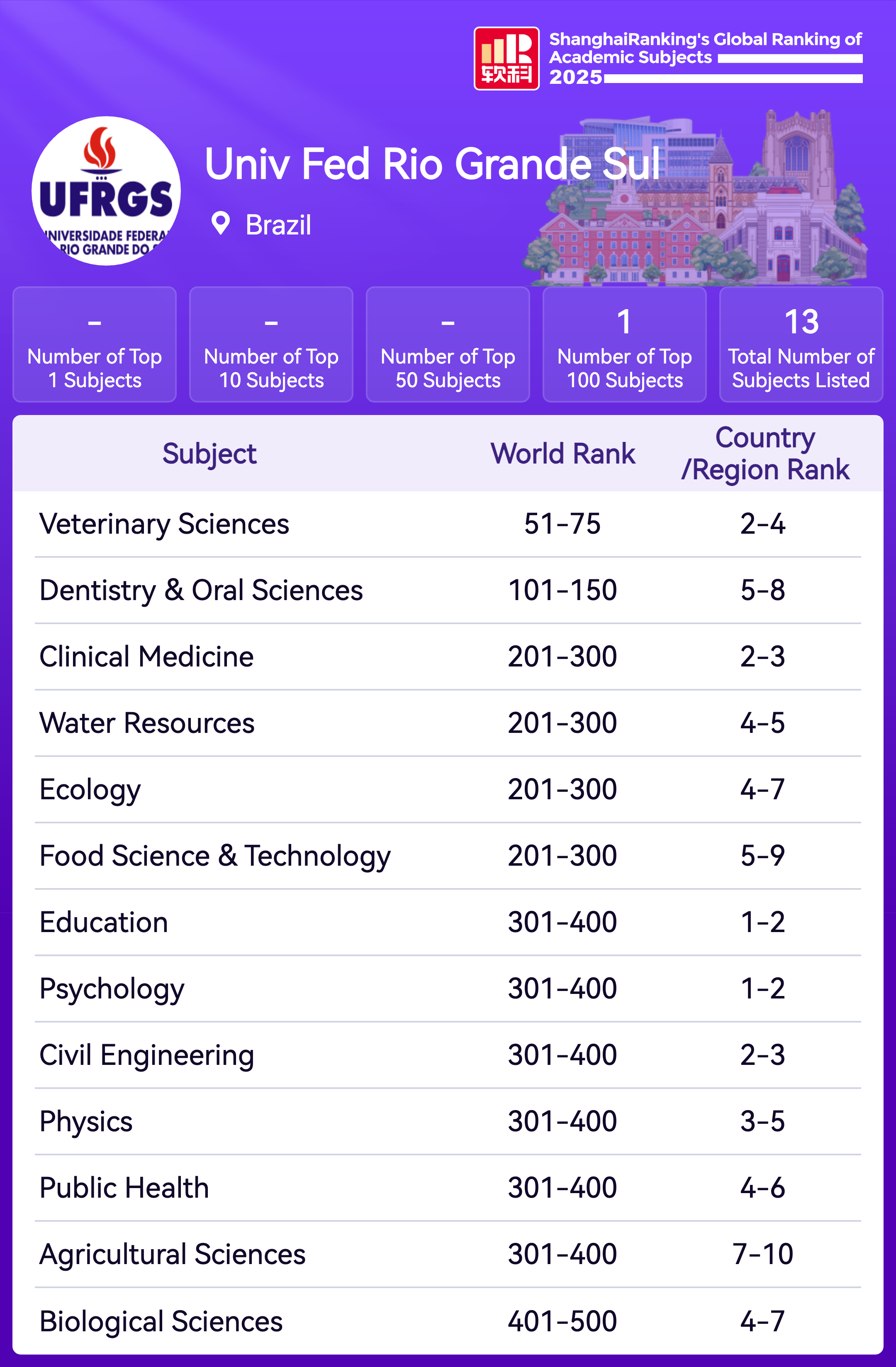 Universidade Federaldo Rio Grande do Sul is part of the federal system of higher education linked to the Ministry of Education of Brasil, being a public federal autarchy, created by Decreto Lei nº 5758 of November 20th, 1934 and federalized through the Law 1.254, of December, 1950 is registered under the CNPJ 92969856/0001-98. History UFRGS’s history started with the foundation of the School of Pharmacy and Chemistry, in 1895, and, soon after, the School of Engineering. That was also the start of higher education in the state of Rio Grande do Sul. Still in the 19th century, Porto Alegre’s Faculty of Medicine and Faculty of Law were founded, what, in 1900, marked the beginning of humanitarian courses in the state. But it was only on November 28th, 1934, that Universidade de Porto Alegre was created, initially merging the School of Engineering, with the Astronomy, Power Engineering, and Industrial Chemistry Institutes; the Faculty of Medicine, with the School of Dentistry and Pharmacy; the Faculty of Law, with its School of Commerce; the Faculty of Agronomy and Veterinary Medicine; the Faculty of Philosophy, Sciences, and Humanities; and by the Fine Arts Institute. The third great moment of transformation of this university took place in 1947, when it started to be designated Universidade do Rio Grande do Sul, or URGS, incorporating the Faculty of Law and the Faculty of Dentistry from Pelotas, and the Faculty of Pharmacy from Santa Maria. In December 1950, the University was federalized, being shifted to the Union’s administrative sphere. Since then, UFRGS – Universidade Federal do Rio Grande do Sul, started to stand out in the national scenery, as one of the largest budgets in the state of Rio Grande do Sul, and as number one in publications and number two in scientific production, among federal universities, taking into consideration the number of teachers. Location Universidade Federal do Rio Grande do Sul is based in Porto Alegre, capital of Rio Grande do Sul. Located between São Paulo and Buenos Aires – border with Uruguay and Argentina -, Rio Grande do Sul is strategically positioned in MERCOSUL, for being in the center of a region in the continent that holds 60%of all Latin America’s economy. With official policies of cultivating investments in education and health care, this State of approximately 10 million inhabitants and 281,000 km2 (108,494 mi2) has a high cultural level and excellent quality of life. Objective and operation Universidade Federal do Rio Grande do Sul is part of the federal system of higher education, being a public benefit available to society, and consolidated by its capacity for cultural, intellectual, and scientific representation. The university has as its objective to form qualified human resources, with scientific and technological abilities, and who are committed to the exercise of citizenship. UFRGS, community of teachers, students and technical administrative staff, has as main goal higher education, and the production of philosophical, scientific, and technological knowledge, integrated with education, research and extension. UFRGS, as public University, is the expression of a democratic and multicultural society, inspired by the ideals of freedom, respect to differences, and solidarity, constituting a necessary instance of critical conscience in which the community can reflect about their way of life, and their social, economic, and political organization. UFRGS is a centenary institution nationally and internationally recognized. It offers courses in all areas of knowledge and in all levels. Its structure is composed of organs such as high-level administrative offices, UFRGS Teaching Hospital, University Unities, Specialized Institutes, and Interdisciplinary Study Centers. The High-level Administrative Offices comprise Conselho Universitário - CONSUL (University Counsel), Conselho de Educação, Pesquisa eExtensão - CEPE (Education, Research, and Extension Counsel), Conselho de Curadores – CONCUR (Controllers’ Counsel), and Reitoria (Provost’s Office).UFRGS also has Colégio Aplicação, responsible for basic education.