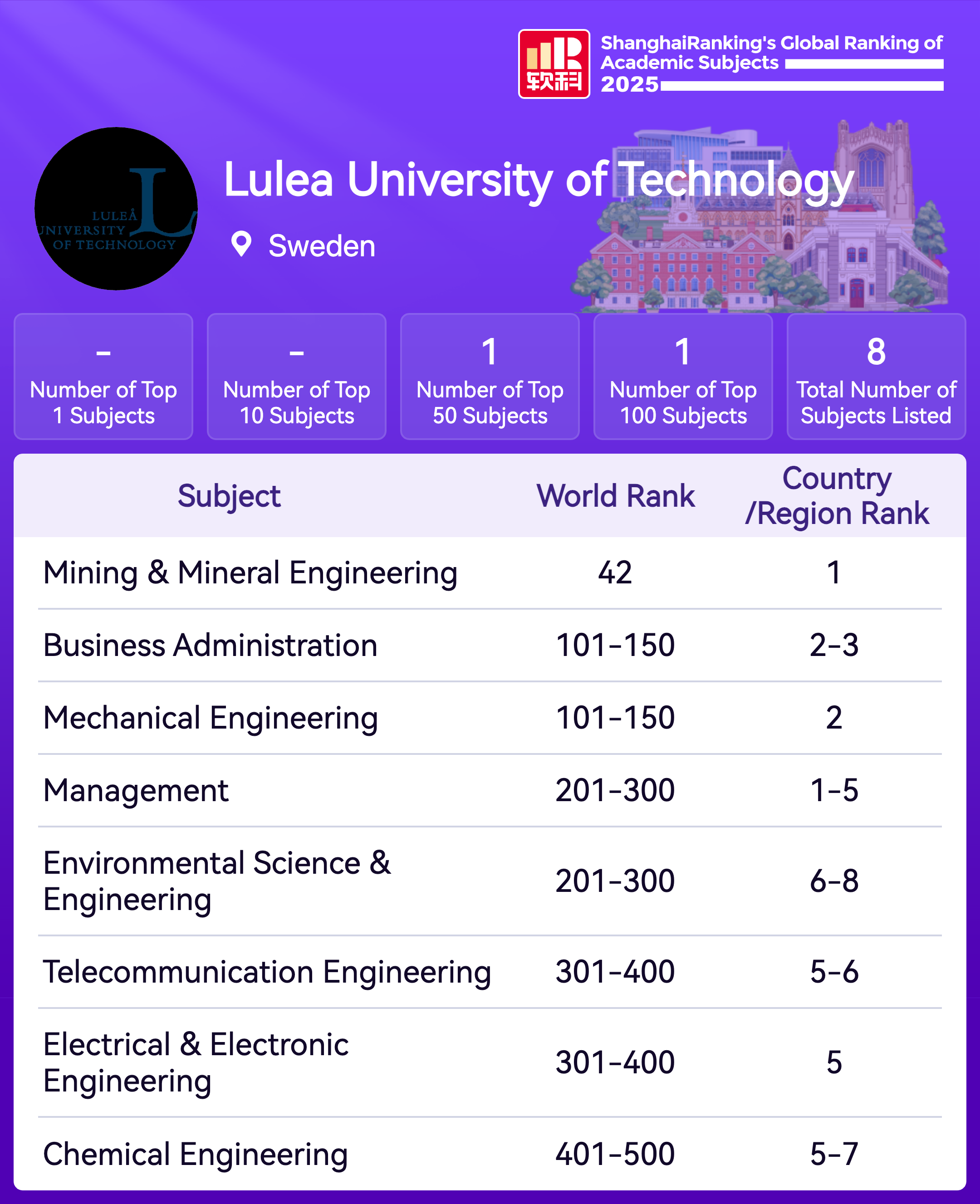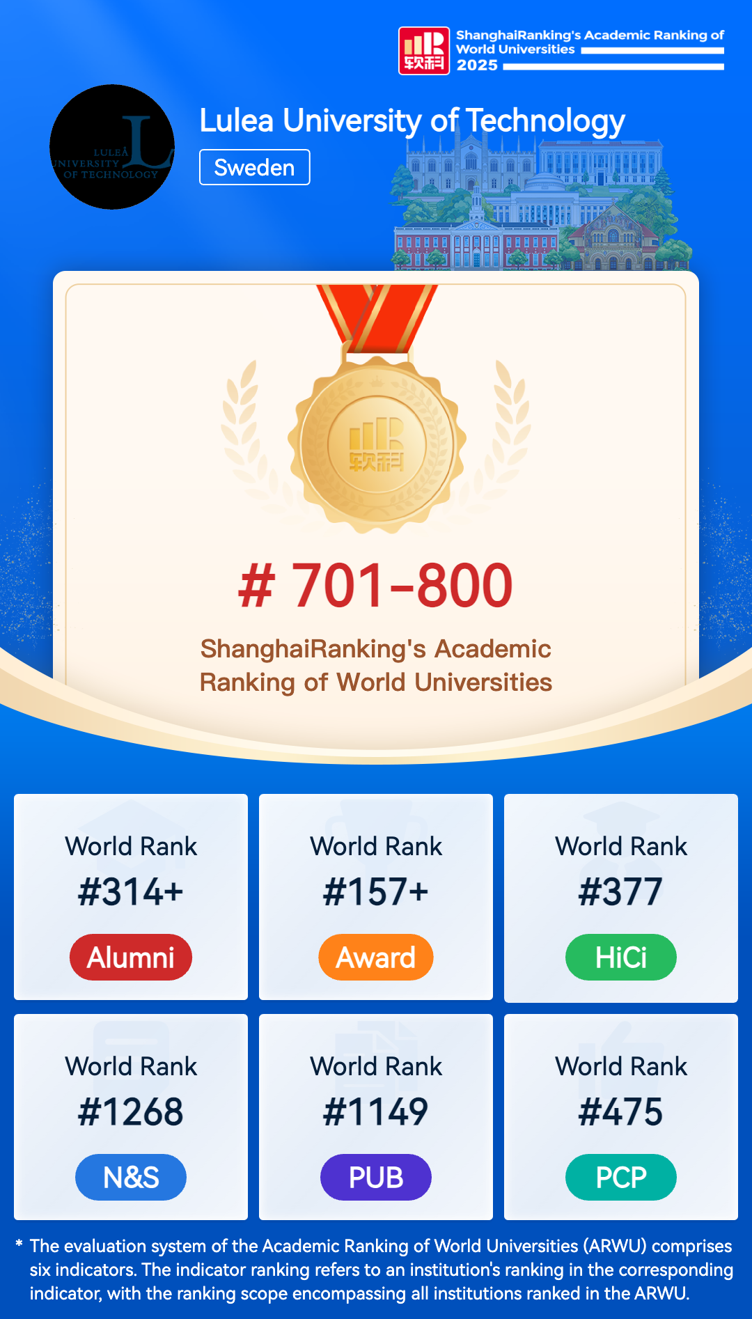 Brief Description of Luleå University of Technology Luleå University of Technology (LTU) is Scandinavia’s northernmost university of technology. We are a research university closely cooperating with industry and society. LTU has the highest percentage of externally-funded research of any university in Sweden, 61 %. Our research focuses on the renewal of knowledge, innovation and practical benefits. Energy technology and renewable energy, mining engineering and metallurgy and material science are some example of LTU’s technical expertise. We are a diversified technical university with intense collaboration between subjects. The University offers doctoral, master’s, bachelor’s, and professional degrees. Luleå University of Technology conducts research and education within engineering, economics, health sciences, humanities, social sciences, educational sciences and the arts. Luleå University of Technology has an annual turnover of more than EUR 160 million. Today the university has 1,600 employees and 17,000 students. Research conducted within LTU has a turnover of EUR 90 million. Our strong research and innovation areas help to develop multidisciplinary issues. The most important areas are renewable energy, attractive built environment, effective innovation and organization, future mining, intelligent industrial processes, empowering ICT, smart machines and materials, sustainable transportation systems and cross-border art and technology. LTU’s strategic research is based on a combination of a strong technological and multidisciplinary research with innovative projects. Two of the areas, green technology and mining and metallurgy, have been identified as strategic areas by the Swedish government. In mining and metallurgy LTU is unique in the fact that it researches the whole value chain from prospecting to final product including environmental aspects. Research is also carried out in areas concerning the moving of Kiruna, a whole city, caused by an expanding mining industry. Camm (Centre of advanced mining and metallurgy) is established at LTU with strategic funding from the Swedish government. Bio4Energy is an interdisciplinary partnership with prominent experts in energy and forestry sciences, chemistry, physics and economics with the goal of developing solutions for sustainable production of renewable fuels, chemicals and materials. LTU is leading the Swedish research (SFC) which focuses on gasification of biomass for production of green fuels. Renewable energy is a research area where LTU together with industry and stakeholders develop sustainable, energy-efficient and environmentally friendly systems and processes. Sustainable transportation systems research focuses on vehicle technology, maintenance systems, vehicle testing, operation in cold climates, road engineering and space technology. The world’s fifth SKF University Technology Center is established at Luleå University of Technology. The center will work with development of smart technologies within condition monitoring, e-maintenance, tribology and sensor technology. A national excellence centre, CiiR, Centre for interorganisational innovation research, is established at LTU. The aim is to create new knowledge about developing innovation systems with focus on non- urban areas using the potential within ICT and digital innovation. The combination of innovation development and general knowledge development within innovation is unique in Sweden. Research within space engineering is focused on developing the understanding of atmosphere and climate systems through data from satellites and cloud measurements. Intelligent industrial processes are very important in order to maintain and further develop a competitive national process industry. Process IT conducts research in close cooperation with industry and organizations within automations systems with embedded internet systems which integrate production, energy systems and energy use in society to develop effective systems. Cross-border art and technology is a multidisciplinary research area. A unique concert hall at LTU is the result of research projects within music, audio technology, acoustics and wood science. The purpose is to develop optimal sound environments for music and art performance. Other interesting research areas are attractive built environment, Empowering ICT and smart machines and materials. Luleå University of Technology recruits students from all parts of Sweden, as well as from other countries all over the world. LTU’s close cooperation with companies and organizations gives the students opportunities to solve problems in direct cooperation with industry and society. For example, 13 students at the Space engineering programme have been selected for a sharp test of their proposal on soldering in space. Another project is building the most fuel-efficient car for the Shell Eco marathon contest and building a house for sustainable living. The Learning resource center, library, helps students and researchers with information retrieval, learning support and publishing their work. Students’ sports are big at the university both outdoors and indoors. You can easily reach places where you can take part in skiing down-hill or cross-country, or choose between body balance, cross-training, aerobics, squash, ice-hockey and more at the student sport center or go dog-sledging or ice fishing in the archipelago. The academic environment within LTU is very open between students, researchers and professors. The warm and close interpersonal relations are important aspects of our university culture. Here, you will form strong friendships, not just with colleagues, but with people from other departments, faculties and nationalities.