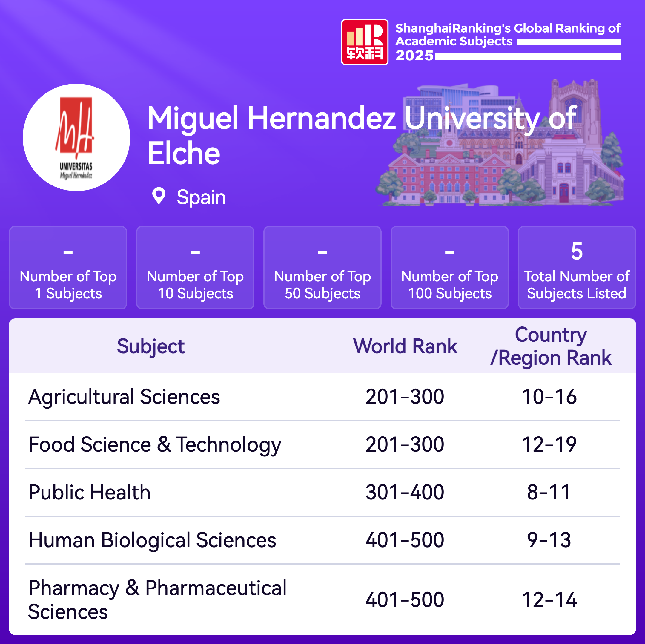 The Miguel Hernández University is a Spanish public University established in 1996. Academic activities began in the 1997/98 academic year. The Miguel Hernández University of Elche has 4 campuses (Elche, Sant Joan d'Alacant, Orihuela, and Altea) and 75 buildings whose total surface area covers 947,635 m2. Its constructed surface area is 209,876 m2. Currently, the UMH is home to 25,247 students, of which 13,002 are enrolled in official degree programs (bachelor, master, PhD), with the remaining 12,245 learning in continuing education programs. Its budget for 2019 is 106,191,255.52 euros The UMH offers 25 bachelor's, 53 master's, and 13 doctoral programs adapted to the European Higher Education Area in the fields of the arts, experimental and technical sciences, engineering, and health and social sciences at its 4 university campuses. In addition to these official programs, the UMH also offers hundreds of its own continuing education courses and programs, including University Expert, unique UMH Master's, Advanced University Diploma, University Specialist, Summer, Winter, Refinement, Bridging, university access, and language instruction, among others. Tuition rates for official programs vary, from between 982 € (for undergraduate experimental-level 1 programs) to 1389 € (for undergraduate experimental-level 5 programs). The UMH is particularly concerned about its students entering the labor market. Here, the University has excelled, achieving excellent results thanks to more than 9,500 businesses maintaining collaboration agreements with the University. This has resulted in over 59.000 student internships the last years. To improve the employability of its students, the UMH organizes several employment workshops each year focused on the diverse professional fields its students are trained in. Another University objective is promoting entrepreneurship in its students, through which the UMH has set the Program of University Entrepreneurs in motion. The UMH has also fostered partnerships with other national and international institutions to promote student mobility and attract foreign students. In its bid for its internationalization, the UMH has set in motion a complete program of activities to facilitate foreign academic stays and to receive students who wish to further their education within our classrooms. Research Research has an essential function at the UMH, which has adopted asfundamental missions encouraging and developing scientific, technical andartistic research of excellence, and training its researchers with postgraduate studies and doctoral programs in addition to specialized programs. UMH research activities are closely related to the socioeconomics urroundings of its campuses but additionally possess a relevance and level ofexcellence recognized nationally and internationally, made evident by the high number of collaborations maintained with other prestigious centers and institutions through R&D agreements and projects. In particular, notable UMH research activities include neuroscience, biotechnology, health, statistics and operations research, engineering, information and communications technology, industrial technology, materials, production planning and agri-foodsystems, among others. The UMH is interested in strengthening relationships with companies and its socioeconomic environment further through the transfer and licensing of itsresearch results. To accomplish this, the University constantly participates injoint research projects with national and international companies, using itsstate of the art research facilities and capabilities. Since it was founded, the UMH has been clearly committed to setting in motion an ambitious system for quality, and this has allowed for continuousimprovement in its collective activities. Over the years, our Quality Systemhas been in use at all the UMH centres, departments, services and administrative units, with prominent recognition for the quality, excellence and innovation of the UMH resulting from this. Elche Campus The Office of the Rector and the University’s central services, as well as four schools, four research institutes and twelve departments are located in the city of Elche. In particular, the degree programs taught here include law, journalism, business administration, labor relations and human resources, sports science, psychology, biotechnology, business statistics, environmental science, electrical, electronic, mechanical and telecommunication technologies engineering, and computer engineering in informationtechnology in addition to various masters and postgraduate courses. This campus also contains sporting facilities including a golf course, paddle tennis courts, a pool, and a sports hall. Sant Joan Campus In Sant Joan, beside the university hospital, the UMH campus is dedicated to the health sciences. Housed here are two schools, two research institutes, six departments and several laboratorios for training students. Degrees in medicine, physiotherapy, podiatry, occupational therapy, pharmacy and various postgraduate courses are taught on this campus. The Institute of Neuroscience and the Drug Dependence Research Institute have their headquarters here. Orihuela Campus In Orihuela, there are two schools and five UMH departments distributed between two university locations (Desamparados and Salesas), where technical and social science education, respectively, are offered. The courses taught at Desamparados, in addition to various masters, include food science and technology, agri-food and agri-environmental engineering. At Salesas, the degrees offered include business administration, political science and public management. Altea Campus This center is dedicated entirely to the arts. Offered here is the degree in fine arts, and the campus contains a multi-sport court as well. This campus has workshops and studios for painting, sculpture, illustration, design, drawing, modeling, dance, etc., for students in a fine
