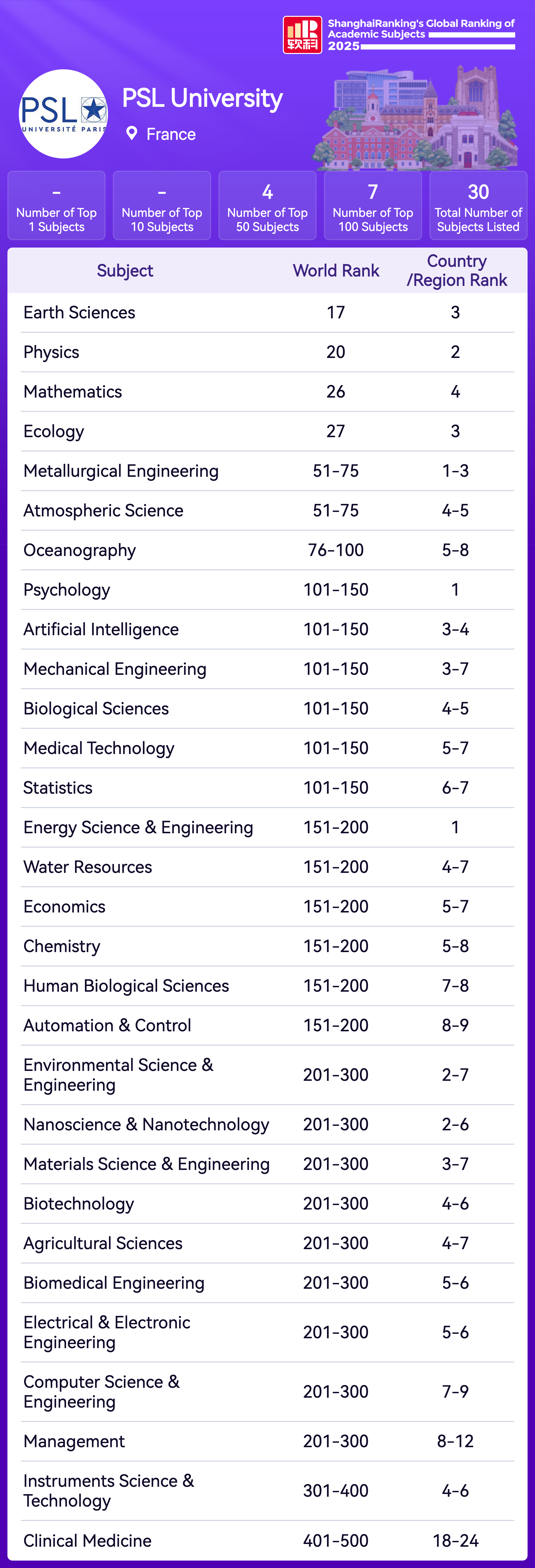 Université Paris Sciences et Lettres - Université PSL was founded on a two-fold conviction: first, that innovation and creativity are the only solutions to today's global challenges and second, that the major academic centers across the globe will play a key role in the development of these solutions. Research is at the very heart of PSL's vision. Our researchers and our cutting-edge research centers and laboratories are engaged daily in pioneering bold responses and innovative solutions to the complex challenges of today's world. PSL's academic programs are based on their research and methodology. PSL offers our 16,000 students the opportunity and resources necessary to realize their full potential and give free rein to their creativity. At PSL, academic training goes beyond the simple acquisition of knowledge and expertise; our programs are designed to help students develop critical thinking and to train agile and curious minds , by giving them the intellectual tools they need for a lifetime of excellence. PSL provides a world-class academic environment where disciplines intersect, mutually reinforcing intellectual activities, where basic and applied research go hand-in-hand, and where universities and the corporate world interact. Freedom of thought and entrepreneurship flourish among PSL’s many resources to explore new fields, build innovative curricula, create startups, and disseminate knowledge to the general public.