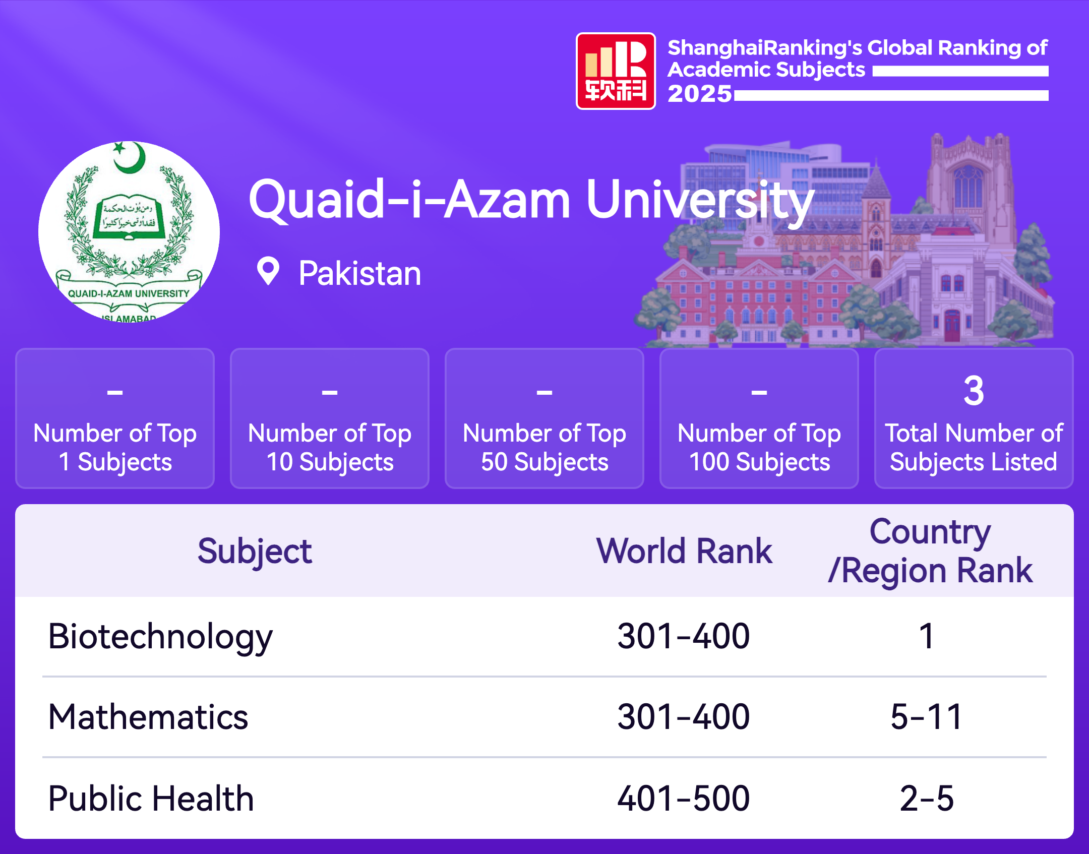 Quaid--Azam University (once named Islamabad University) was established in July 1967 under the Act of National Assembly and started teaching and research programmes for PhD and MPhil degrees. It was, however, gradually and later decided to offer Master’s, graduate, and now undergraduate programmes. The University, for its international repute, faculty and programmes attracts a large number of foreign students although it offers admission to a measured number of students from all regions of the country as it is a federal public sector university. It has been able to establish its links with some selected universities in Europe, South Asia and the United States. The international educational and research institutions including UNESCO,IRSIP, Agencia Espanole de Cooperacion International (Spain) etc. collaborate their research activities with the Quaid--Azam University. Moreover, a reasonable size of the faculty members of the University have been working in the international universities like Oxford, Cambridge, Columbia, Heidelbergetc. earning applause and awards such as International Peace Award from Brussels. Currently, this University has four faculties and nine other teaching and research Institutes, Centre and Schools. Briefly included; Faculty of Biological Sciences, Faculty of Natural Sciences, Faculty of Social Sciences, Faculty of Medicine (affiliated), Area Study Centre for Africa, North and South America, Centre of Excellence in Gender Studies, National Institute of Pakistan Studies, National Institute of Psychology, National Institute of Historical and Cultural Research, National Institute of Asian Civilizations, and the Computer Centre. For growing educational and technical needs of the country, the University imparts quality education and training on lower strata of life in the field of computer and runs a wide range of short term certificate and diploma courses. In all, the University’s academic programmes, have an enrollment of over 5,500 students. The University also maintains a high standard in providing services. It has well equipped classrooms, state of the art labs and libraries. Other facilities like hostels for male and female students, sports and play fields, transport, mosque, bank, utility shop, post office, photocopying and thesis/paper binding, telephone, café etc. are centrally located on the Campus