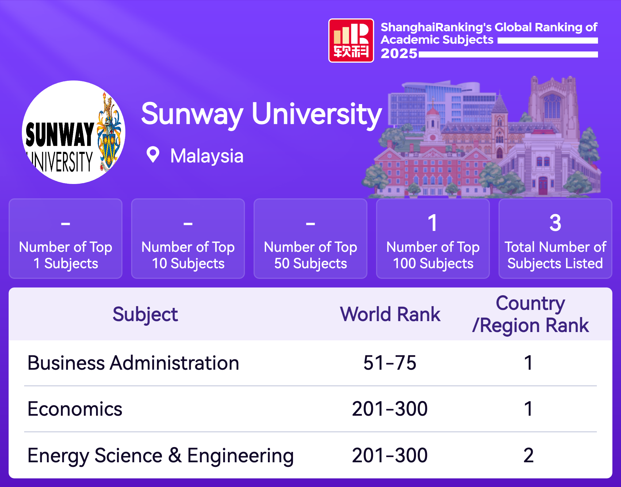 Sunway University is one of Malaysia’s leading private universities dedicated to providing quality holistic education for all, regardless of race, creed, or financial standing. By upholding our core values of Integrity, Humility, and Excellence, we support the discovery, advancement, transmission, and application of knowledge that meets the needs of our society and the global community. Our values-based education guides our actions and behaviour. We strive to ensure our campus community develops a sustainable mindset by embracing an ecological worldview, by understanding systems perspective and by developing emotional intelligence. Sunway University is part of the Sunway Education Group, which is owned and governed by the Jeffrey Cheah Foundation (JCF), Malaysia’s largest education-focused social enterprise. Through this unique not-for-profit structure, operating surpluses are channeled back into the institutions or disbursed as scholarships, research grants, and expansion funds for faculty and facilities to ensure quality education in perpetuity.