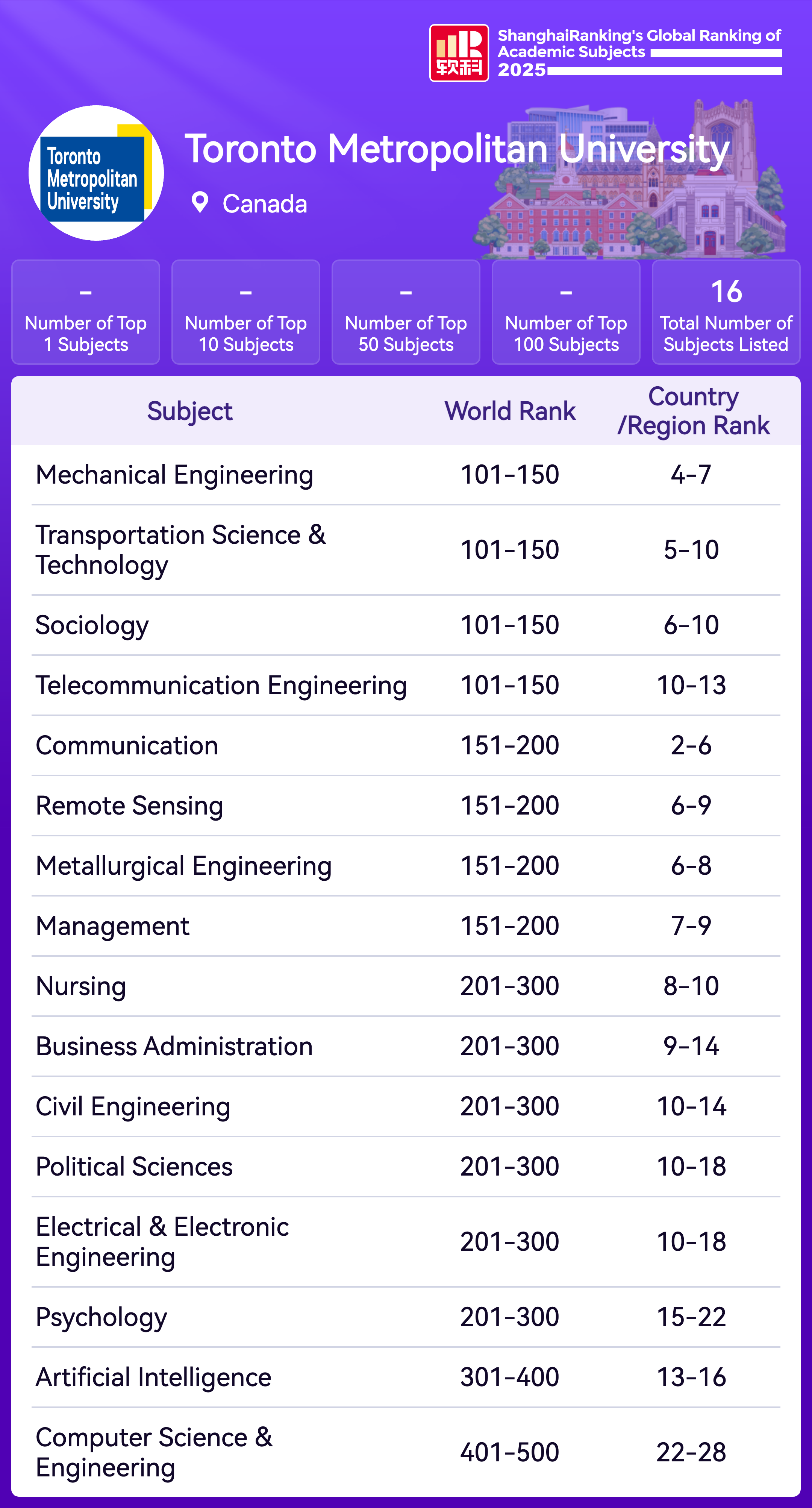 Toronto Metropolitan University (TMU) is a world-class research institution and Canada’s leader in innovative, career-oriented education, offering more than 60 undergraduate programs, over 65 graduate programs, and 80 continuing education certificate programs. The university comprises ten faculties, including the Lincoln Alexander School of Law and the TMU School of Medicine. Its Chang School of Continuing Education is Canada's leading provider of university-based adult education. The university's focus on innovation and entrepreneurship is represented most distinctly by the Digital Media Zone (DMZ), one of the world's top university-based incubators and a place for students to collaborate and bring their digital ideas to the marketplace.