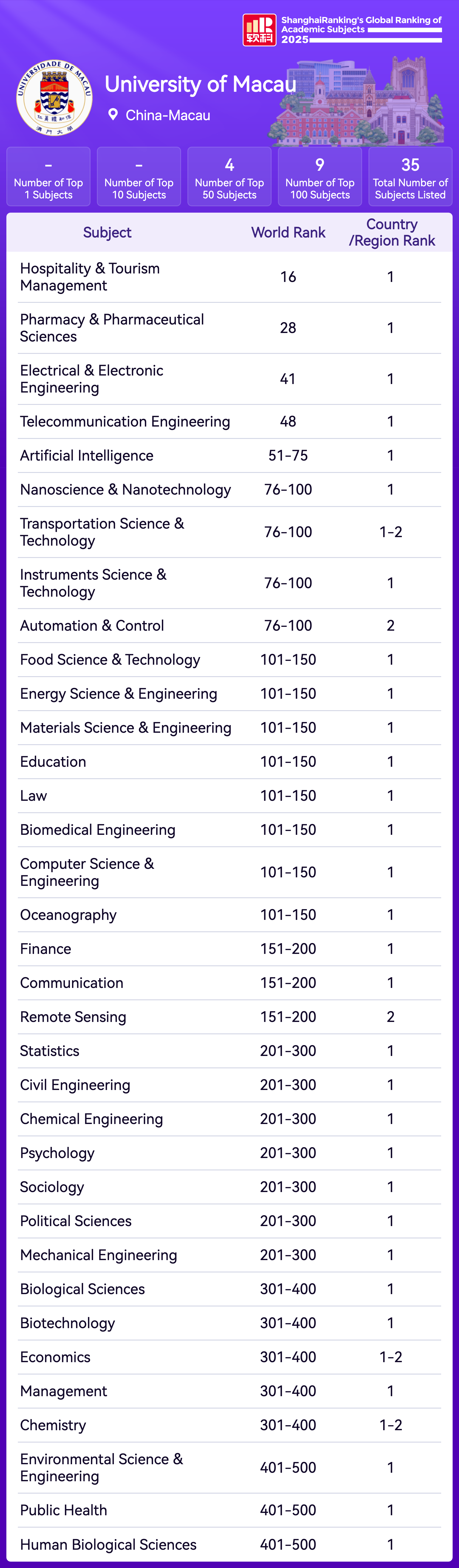 The University of Macau (UM) was founded in 1981 as a private institution by the name of University of East Asia. Through the years of development, it has become a leading university in Macao. UM offers approximately 130 bachelor's, master's and PhD programmes—with English as the main medium of instruction—through various academic units, including Faculty of Arts and Humanities, Faculty of Business Administration, Faculty of Education, Faculty of Health Sciences, Faculty of Law, Faculty of Social Sciences, Faculty of Science and Technology, Institute of Chinese Medical Sciences, Institute of Applied Physics and Materials Engineering, Institute of Collaborative Innovation and Honours College. Currently, UM has approximately 12,000 students and 650 teaching staff members. UM is committed to producing outstanding graduates for society, becoming a world-class university, providing elite undergraduate education, developing a high-calibre faculty team, enhancing the development of unique academic programmes, and building an efficient and environmentally friendly campus.
