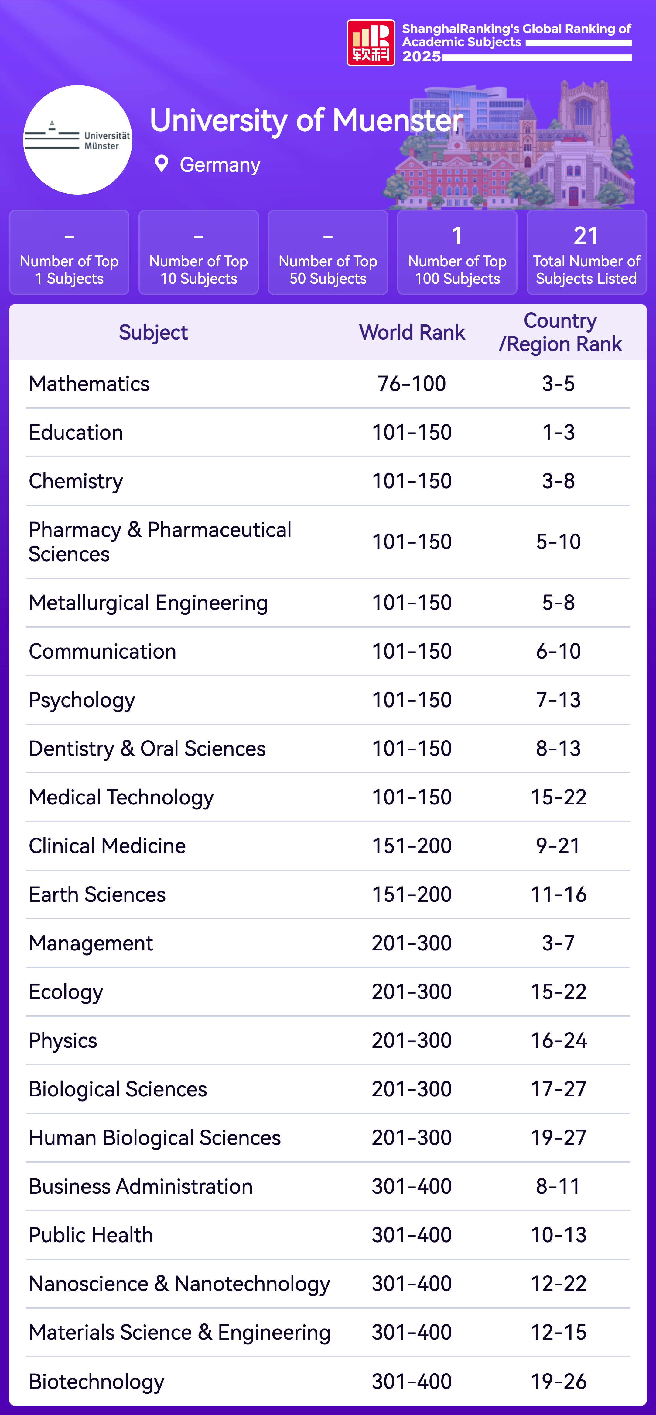 TOP-LEVEL RESEARCH The University of Münster has developed a strong research profile in natural sciences, the humanities, medicine, law and business administration. It targets top-level research in high-performance areas for and combines this with promoting first-class young researchers. At the same time, by ensuring that broad research can be carried out it creates a secure basis on which excellence can thrive. HIGH-QUALITY TEACHING The University of Münster’s aims in the field of research are closely linked with its own commitment to provide high-quality courses of study covering a wide range of subjects. It has taken a pioneering lead in changing teacher training to the double bachelor degree. The second step – a bottom-up process – will involve the masters courses. The development of programmes for structured doctoral courses represents the third step in the realisation of the objectives set out in the Bologna process. The University of Münster thus provides the best possible teaching on the basis of high-quality broad and top-level research. PROMOTING YOUNG RESEARCHERS The University of Münster organises the promotion of outstanding academic junior researchers in graduate schools which provide structured doctoral courses. Moreover the university creates an environment conducive to top-level research carried out by postdocs. It also supports the setting up of groups of young researchers and the creation of junior professorships in order to strengthen the links between postgraduate education and research. GENDER MAINSTREAMING The University of Münster considers gender equality to be a task of strategic importance. The aim is to make it easier for women to combine an academic career and family interests. It is in combination with the high quality of life offered by the Münster region that the university hopes to reap benefits in recruiting brilliant researchers in the future. The University of Münster's second strategic objective in the field of gender mainstreaming is to apply suitable measures to strengthen women’s social qualifications in pursuing academic careers. In order to initiate such measures to reach these goals, the University of Münster subjects its gender mainstreaming policies to an external “family-friendly university audit”.