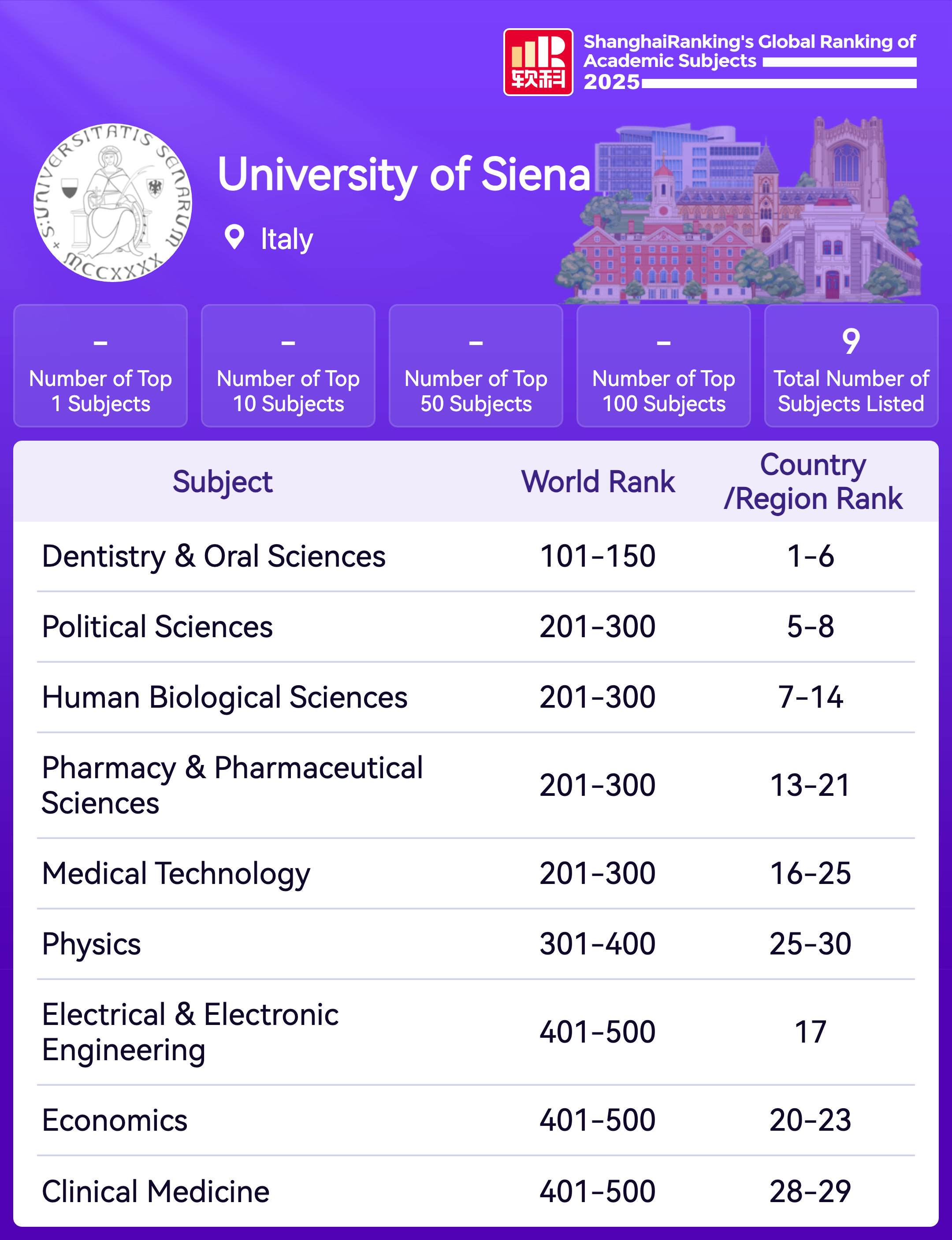 UNIVERSITY OF SIENA: HIGH QUALITY RESEARCH AND TEACHING, WORLD-FAMOUS LOCATION The University of Siena is an internationally significant research university with undergraduate, graduate, postgraduate and professional programmes of the highest quality. Where we are Siena is located in central Italy - between Florence and Rome - in the heart of Tuscany’s rolling hills and breathtaking landscapes. Tuscany is the cradle of Italian art and language: a famous land of great culture and civilisation, with an extraordinary natural environment and an outstanding gastronomic tradition. An ancient history The University of Siena is one of the oldest universities in Europe, having been founded in 1240. The history of the University of Siena has evolved alongside Tuscany’s cultural tradition since the Middle Ages. The city’s university has grown constantly, especially in the twentieth century, passing from four hundred students enrolled between the two World Wars to over twenty thousand students in recent years. Over the years it has expanded to comprise the current 15 Departments . The University of Siena boasts 58 Research centres, 29 Interuniversity centres, a network of 6 museums, a Language Centre and a Library System covering all of the subject areas. A strong international mission Over the years the University of Siena has enhanced its strategy for internationalisation, aiming to attract students and researchers from all parts of the world. Some of our degrees are taught partially or entirely in English and double degree agreements have been set up. Bachelor (First Cycle) Degree held in English: - Economics and Banking Master’s (Second Cycle) Degrees held in English: - Finance - Economics - Management and Governance - Medical Biotechnologies - Chemistry - Computer and Automation Engineering - Electronics and Communication Engineering - Language and mind: linguistics and cognitive studies - International Studies Degree programmes The University of Siena offers Bachelor’s Degrees, Master’s Degrees, Long Single Cycle Degrees and a large number of Doctoral Programmes and Post-graduate courses. The teaching and research activities cover a wide range of topics: Biotechnologies, Economics, Engineering, Humanities, Law, Mathematical, Physical and Natural Sciences, Medicine and Surgery, Pharmacy, Political Science. Promoting sustainability The University of Siena intends to be a leading promoter of sustainability - through its courses research, training and consulting for businesses and institutions, promoting a trans-disciplinary approach to sustainability and its challenges - supporting a student environmental network coordinating MED Solutions , the Regional hub for the Mediterranean of the Sustainable Development Solutions Network (SDSN).