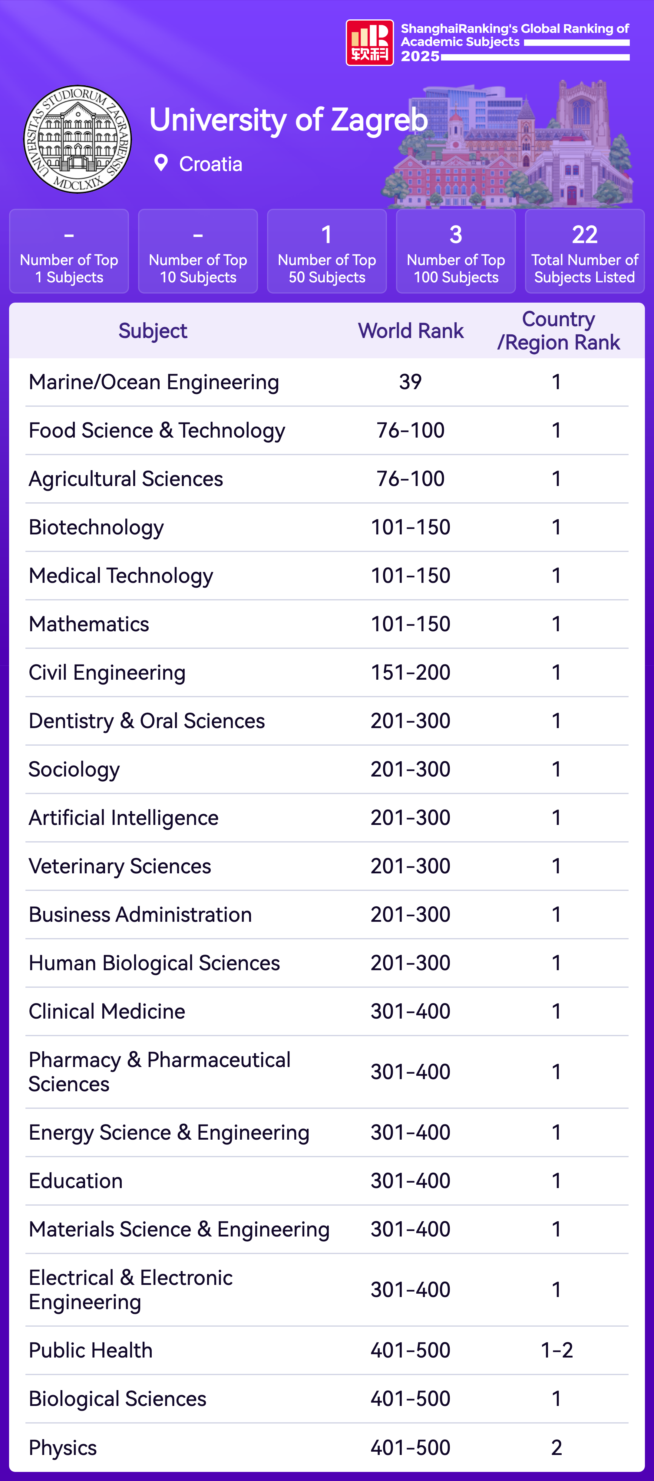 Set up in 1669, the University of Zagreb is the oldest Croatian university, and one of the oldest in South East Europe. It was founded by Emperor and King Leopold I Habsburg as he gave the status and privileges of a university to the Jesuit Academy of Zagreb. The academy was run by Jesuits until 1773, when their rule got dissolved by Pope Clement XIV. It then started teaching Law alongside Philosophy and Theology, being the main institution to educate the Croatian intelligentsia until the end of the nineteenth century. Now the university offers a wide range of degrees including science, architecture, engineering, biomedical sciences, biotechnology, social sciences, humanities and the arts. Some of these courses get taught in English, such as the BA in Business, Economics, Engineering; MAs in Medicine, Managerial Informatics, Economics, Business, Environment, Agriculture. The university has international agreements with the Macquarie University Sydney in Australia, the University of Toronto in Canada, the Charles University in Prague, Czech Republic, the University of Helsinki in Finland, University Panthéon-Assas in France, Dresden University of Technology, Humboldt University in Berlin and Heidelberg University in Germany, Lomonosov Moscow State University in Russia, University of California in the US and many others. Zagreb is the capital city of Croatia, with a population of 800,000. Its culture echoes both its Austro-Hungarian and Croatian past. The city often hosts international music artists. It is also home to one of the biggest open air festivals in Europe, the INmusic festival, as well as the Zagreb Jazz Festival. Zagreb's resident are easily able to also visit cities such as Vienna and Budapest, along with many other famous places in central and eastern Europe.